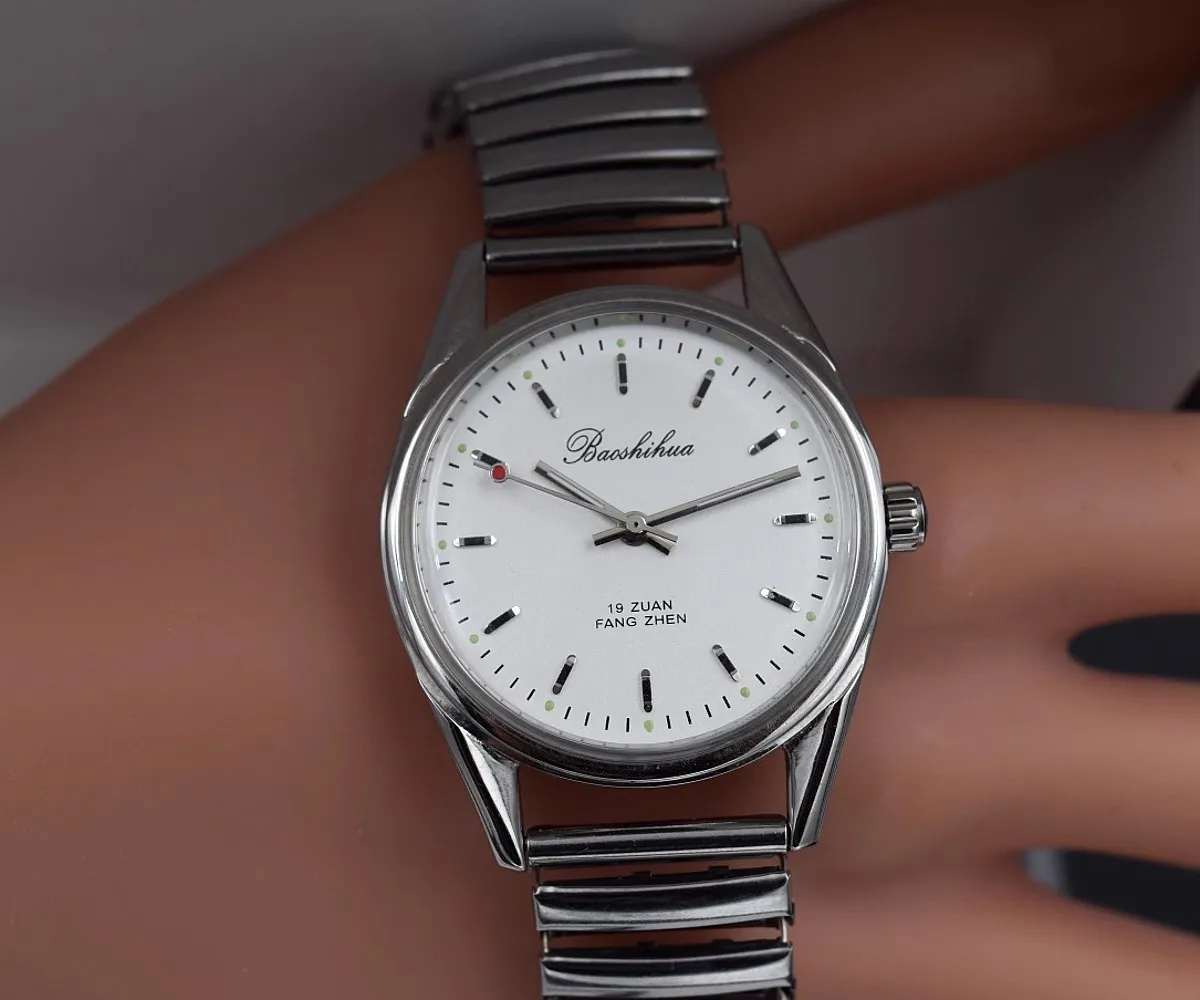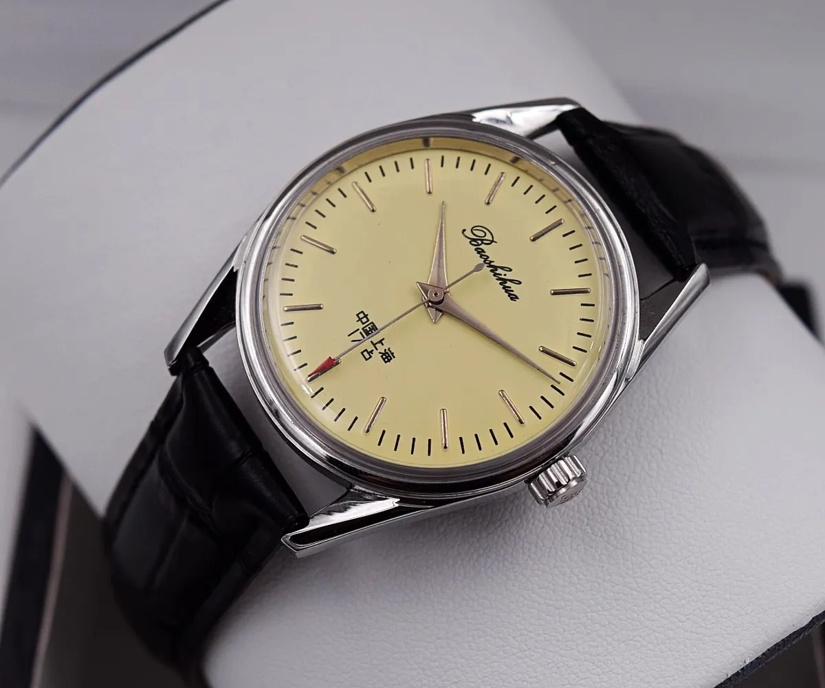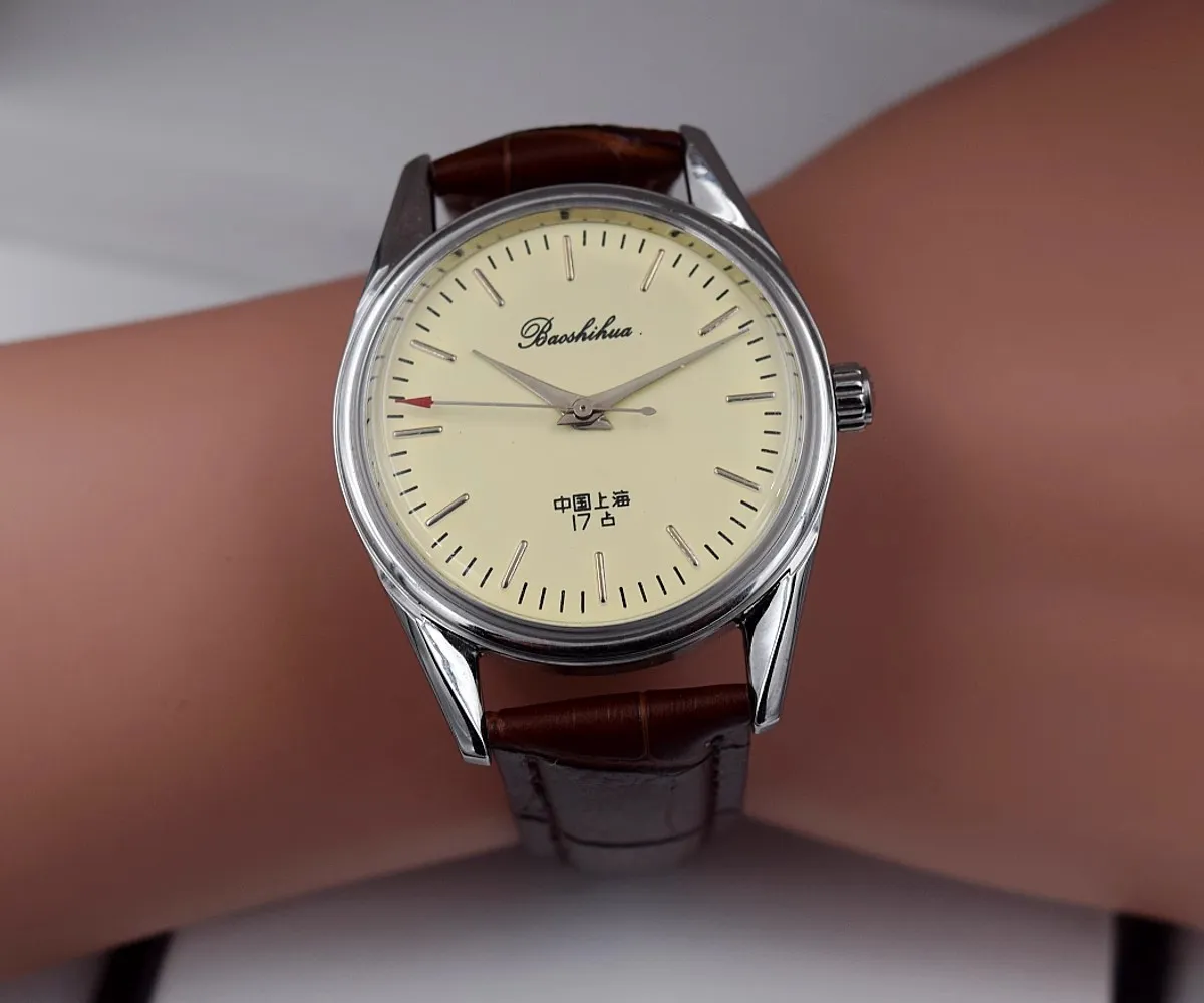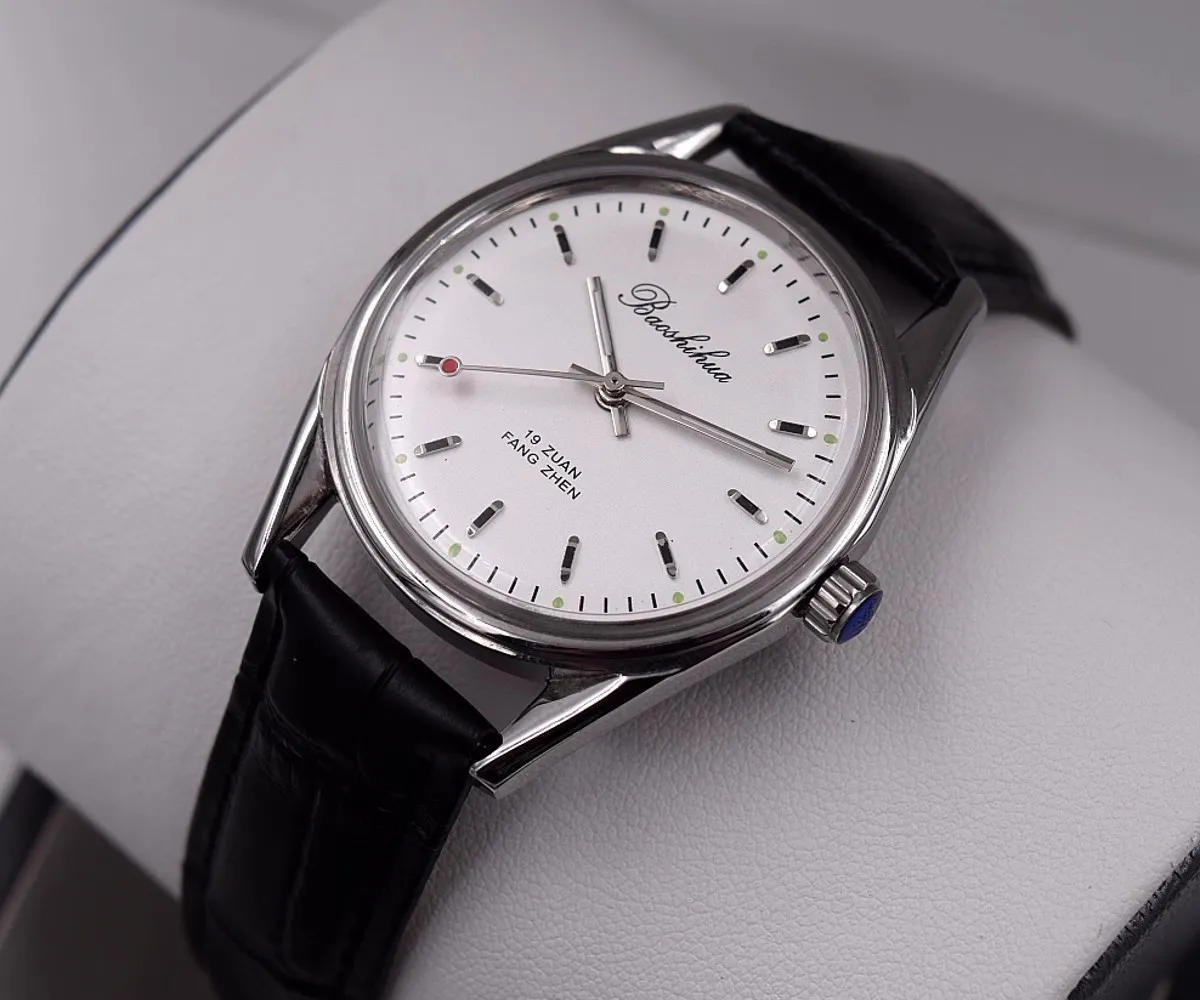 At the heart of this watch is a manual spring-wound mechanical movement, offering a tactile connection to traditional watchmaking. Unlike automatic or quartz movements, the manual winding mechanism requires regular winding by hand, giving wearers a hands-on experience with the art of timekeeping.