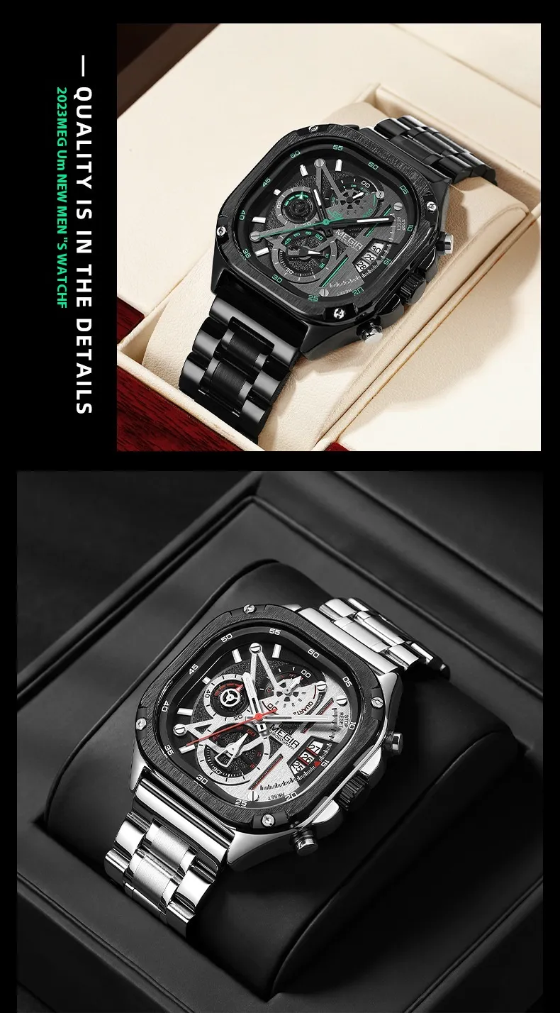 The Men's Square Steel Strap Butterfly Buckle Luminous Waterproof Multi-Function Watch is a striking blend of contemporary design,