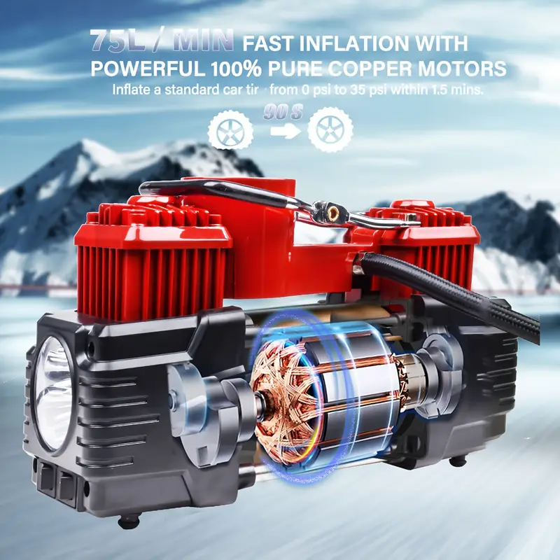The MESHUBA Twin Cylinder Air Compressor is a powerful and portable tire inflator designed for fast and reliable inflation. Equipped with a 12V twin-cylinder system, this compressor delivers high air pressure, making it suitable for cars, bicycles, motorcycles, and other inflatables. Featuring an accurate pressure gauge and an emergency light, this heavy-duty pump is a must-have for roadside emergencies and everyday use.