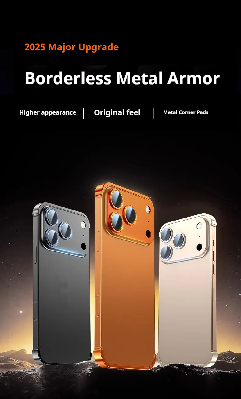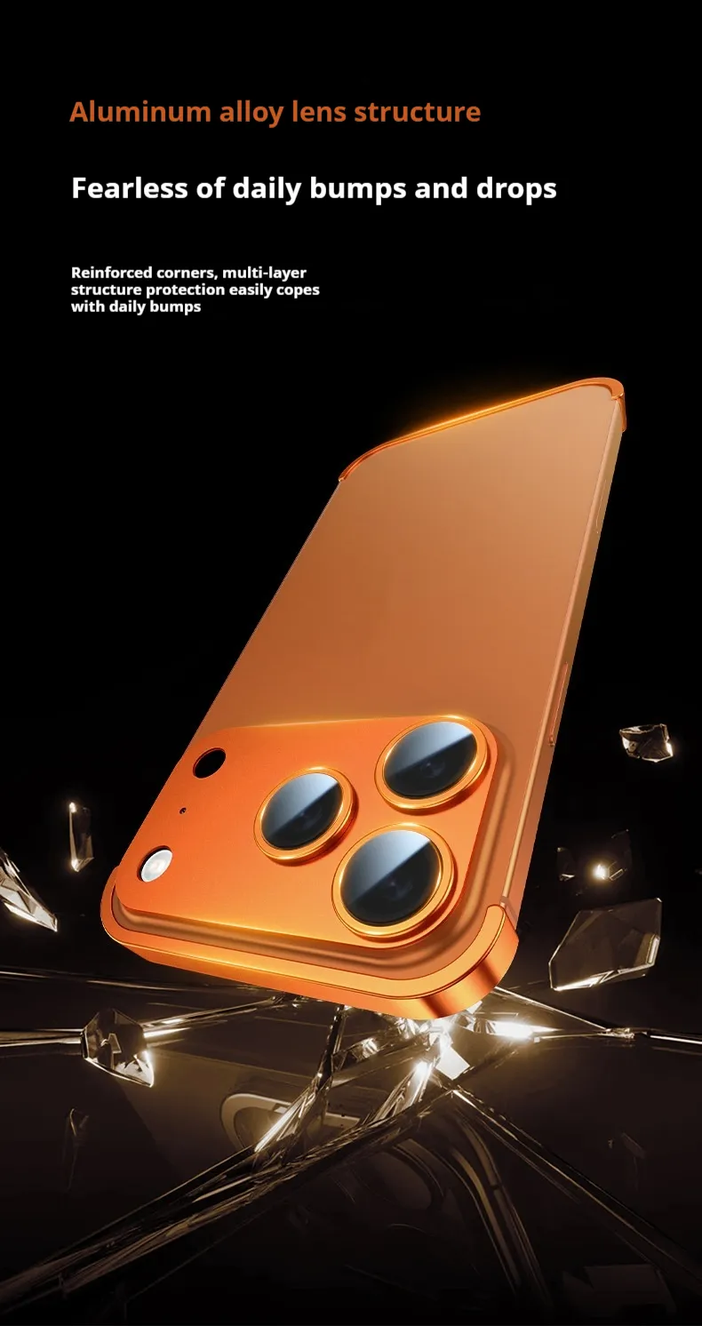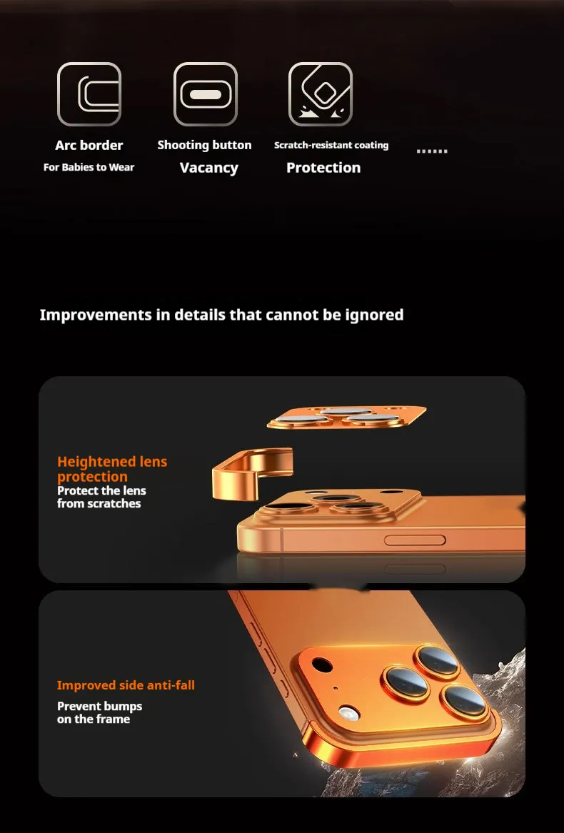 Protect your iPhone in style with the Metal Four-Corner Pad Ultra-Thin Frameless Lens Protective Cover – slim, strong, and stylish.