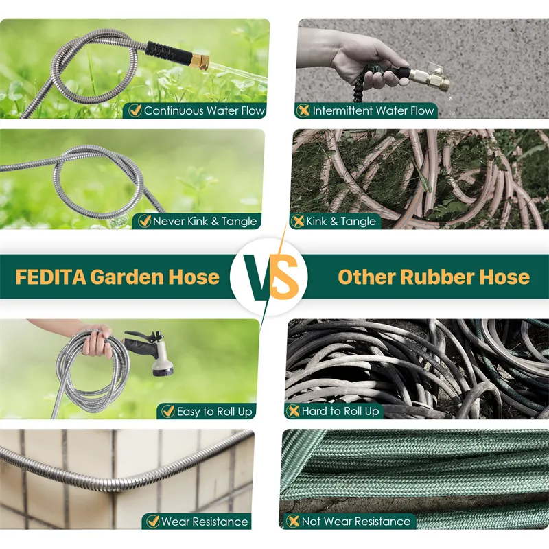 Upgrade your garden care with the 100ft Metal Garden Hose, a durable and flexible stainless steel water hose designed to provide a reliable and hassle-free watering experience. This heavy-duty water pipe is built to withstand harsh outdoor conditions, ensuring long-lasting performance for all your garden, cleaning, and outdoor needs. With its kink-free design, this hose eliminates the common frustrations of tangled or twisted hoses, making it the perfect solution for efficient and consistent water flow.