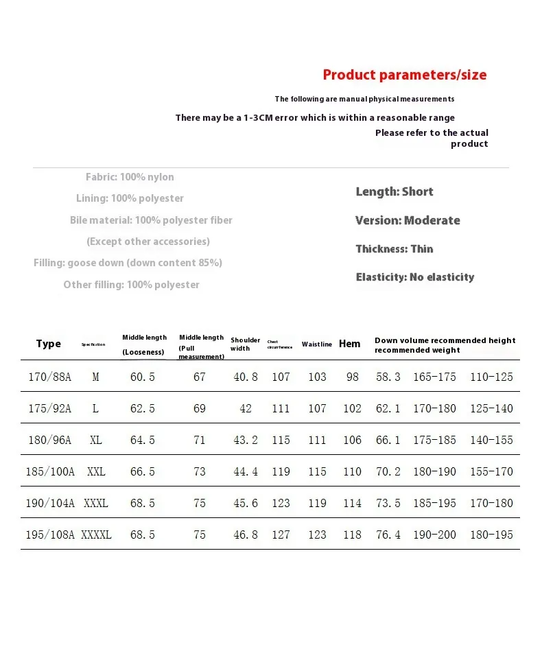 Size: 170/M,175/L,180/XL,185/2XL,190/3XL,195/4XL