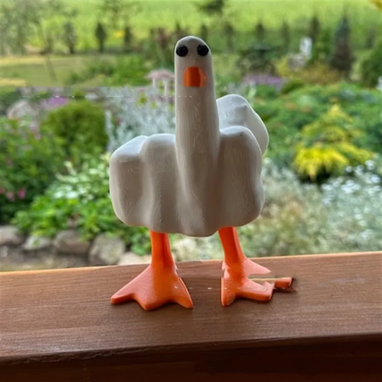 - Design: A duck figurine making a "middle finger" gesture