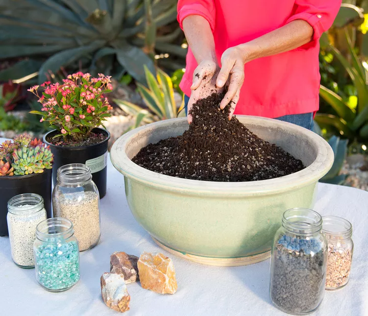 Fill the pot nearly to the top with cactus mix potting soil—it provides the amount of drainage succulents need. You can find a cactus mix for your succulent garden sold at any nursery or garden center.