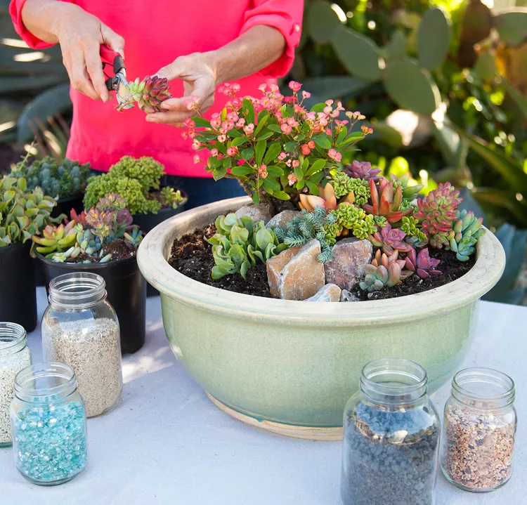 Tuck in small rooted succulents and cuttings so they appear to have grown among the rocks. Vary the plant colors and textures, and