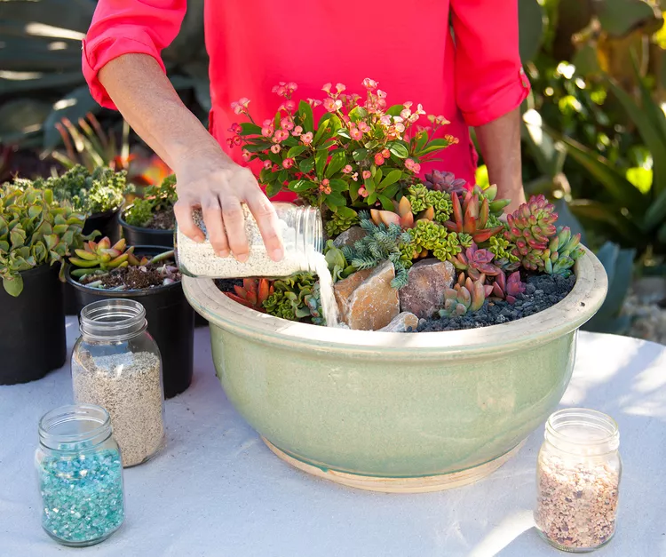 Tuck in small rooted succulents and cuttings so they appear to have grown among the rocks. Vary the plant colors and textures, and
