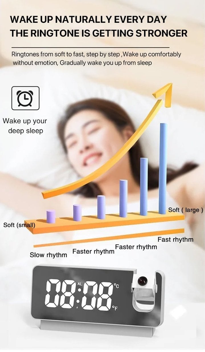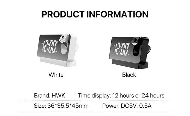 Multi-functional Projection Digital Alarm Clock with 350° Projector, 7'' Larg LED Display, Dual Alarms,USB Charger to Suit Your Needs,A perfect choice for you to be aware of the time in the bedroom, kitchen and office. It is more than a clock. More functions cater to your aspiration for a better life.