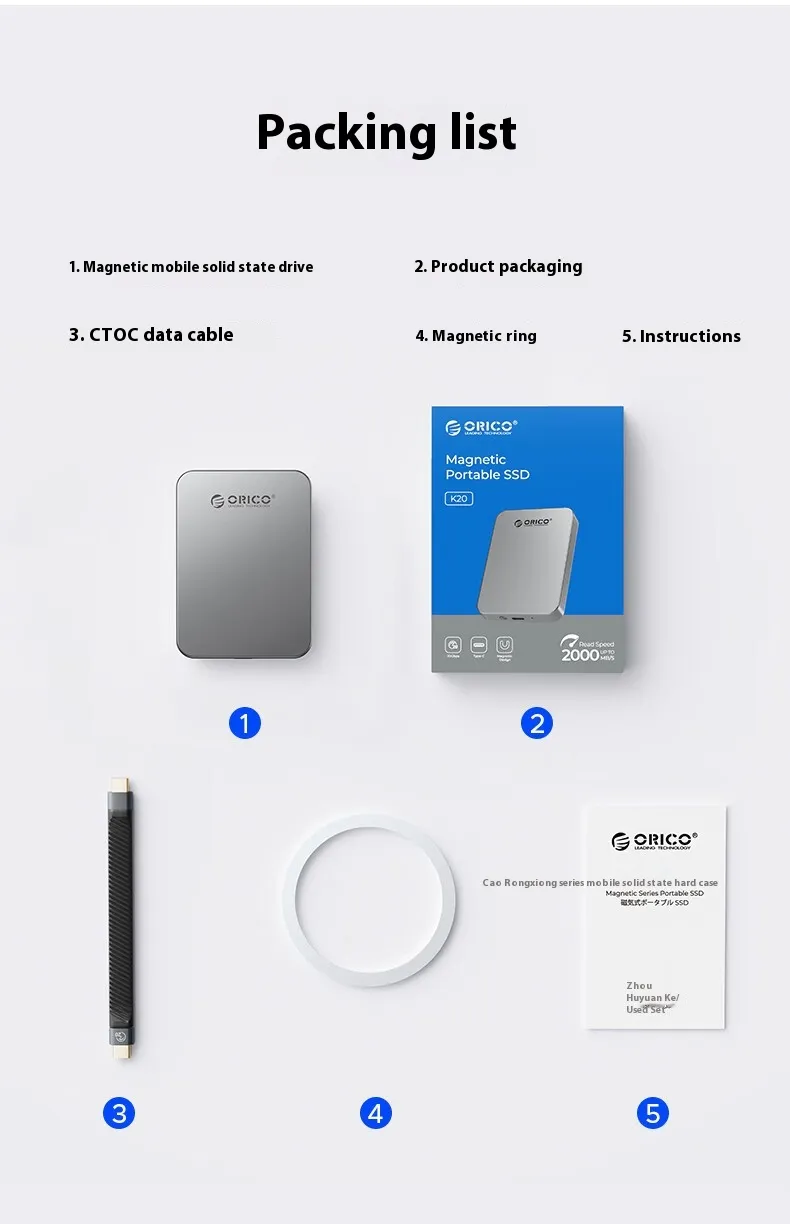 1. Magnetic Mobile Solid State Drive 2. Product packaging box 3. C to C data cable 4. Magnetic suction ring 5. Instruction manual
