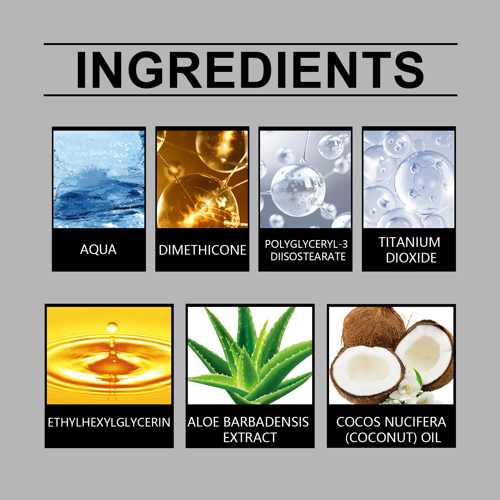 Ingredients: Water, polydimethylsiloxane, polyglycerol-3 diisostearate, titanium dioxide, ethylhexyl glycerol, aloe extract, coconut oil