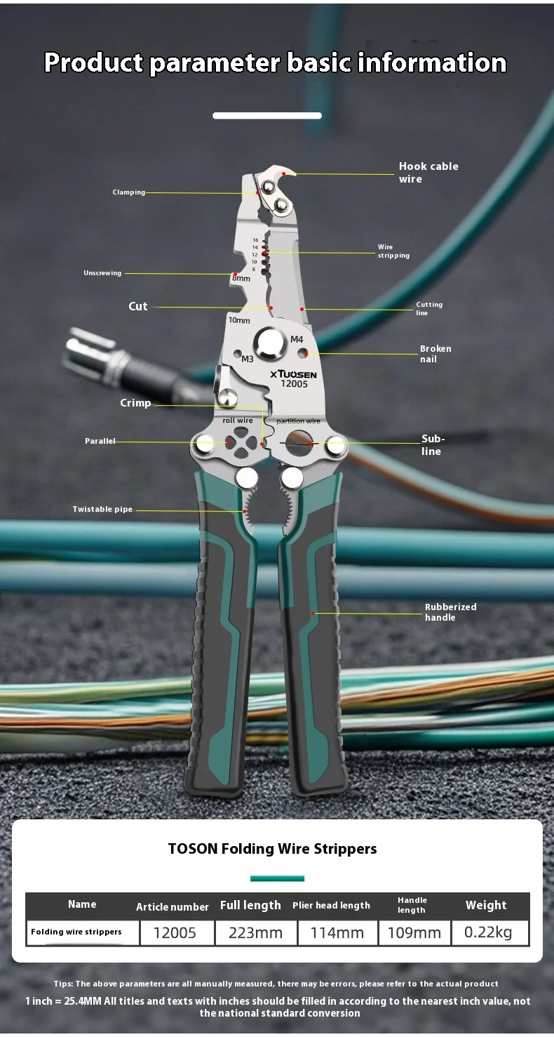 This multi-functional pliers combines wire cutting, splitting, pressing, and pulling features into one easy-to-use tool. The foldable design makes it compact and portable, perfect for professionals and hobbyists who need a reliable tool on the go. With its high-quality construction, these pliers offer durability and precision to ensure efficient results with every use.