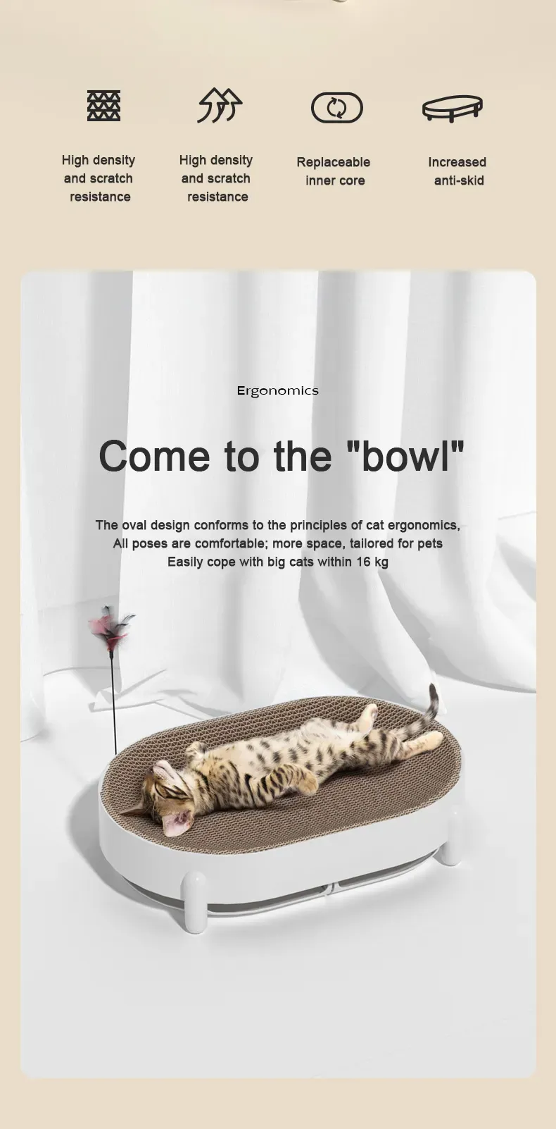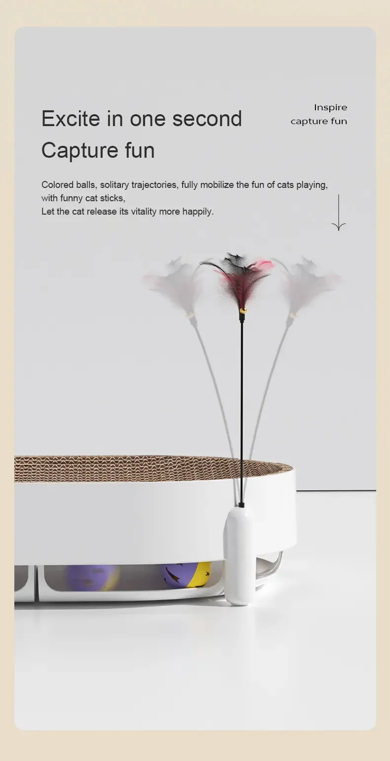 Product functions: corrugated cardboard, bell balls, teasing feathers