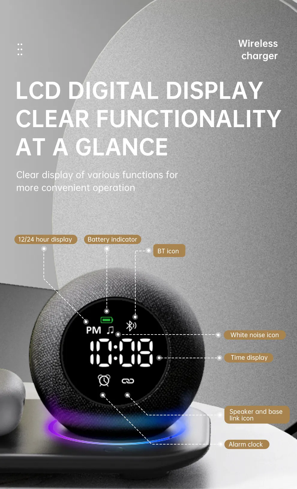- All-in-One Device: Combines white noise, ambient light, alarm clock, and Bluetooth speaker into one compact device.