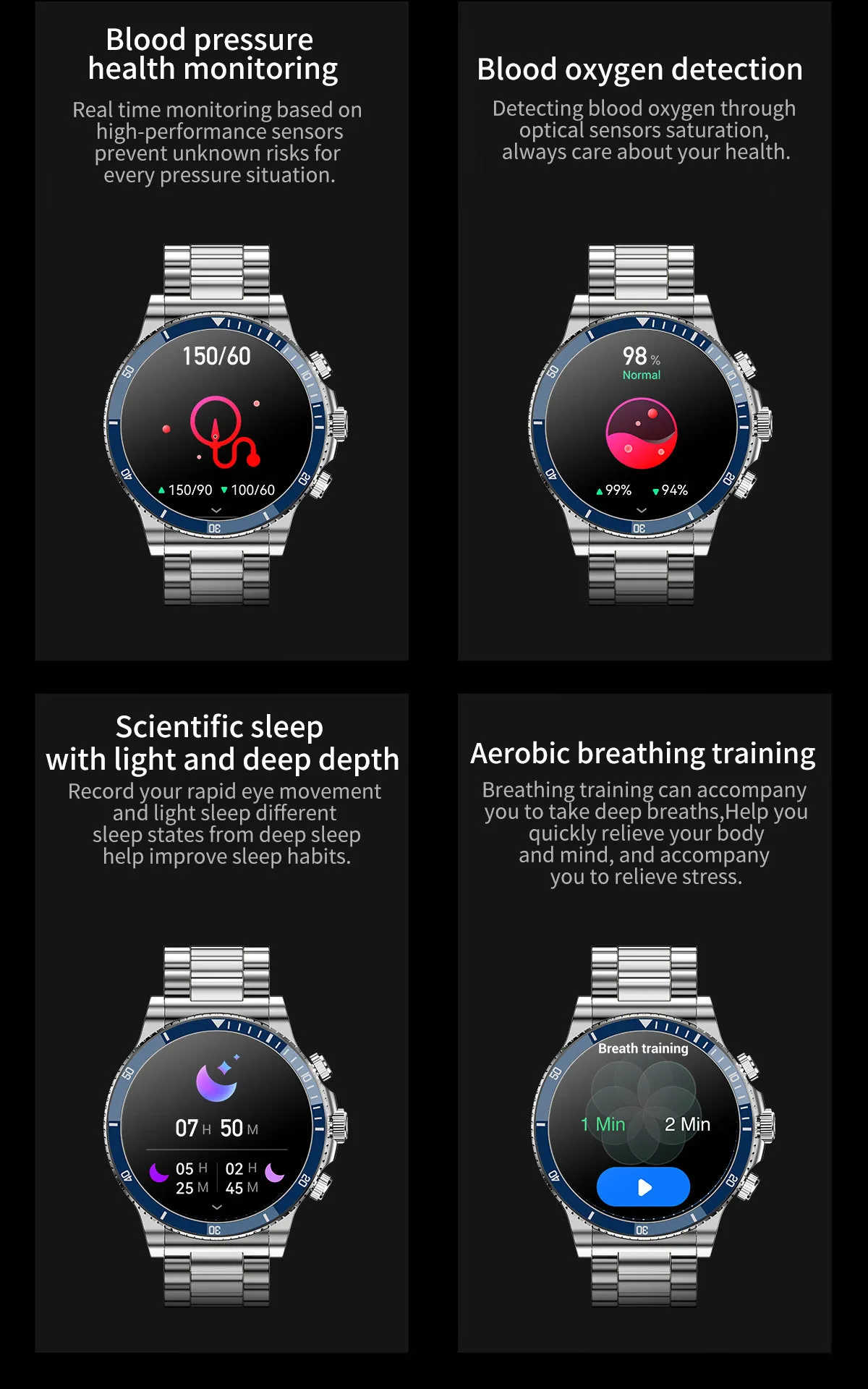 Functions: Waterproof, step counting, heart rate monitoring, blood pressure measurement, Bluetooth call, smart reminder, remote control