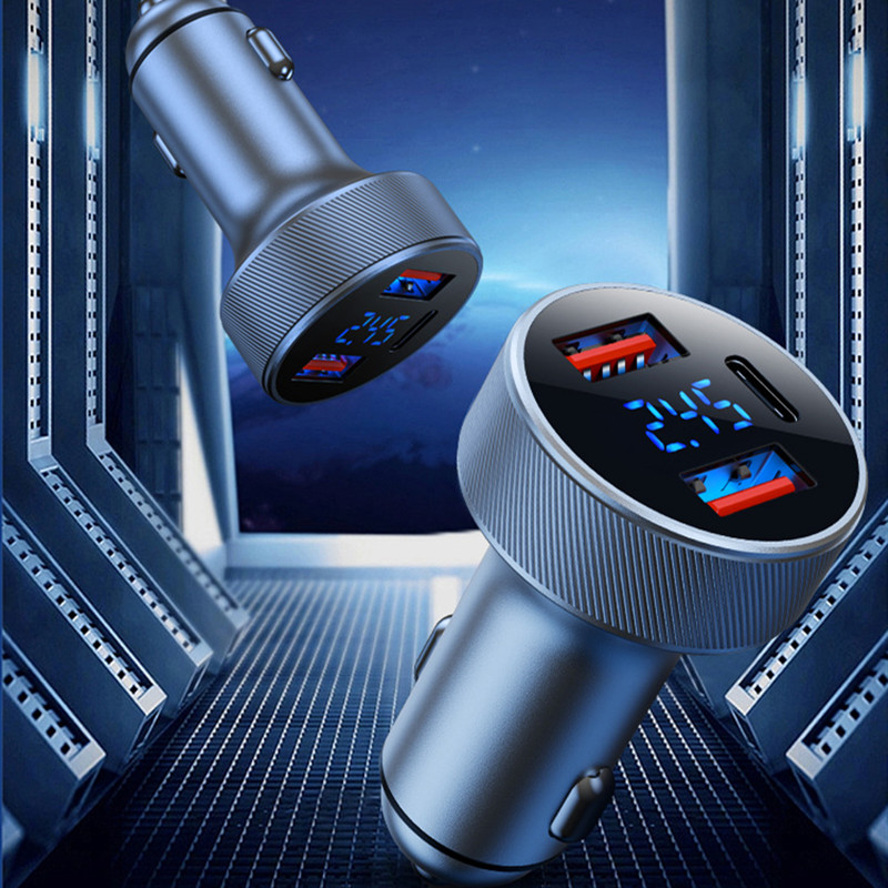 The robust build, crafted from a high-quality aluminum alloy, ensures durability and a premium touch, suitable for any car's aesthetics. Its sleek design is complemented by a user-friendly digital display, encased in a striking iron gray accent. This smart display is engineered to provide you with critical information at a glance, including the precise voltage and charging progress of your devices, to prevent overcharging and extend the lifespan of your electronics.