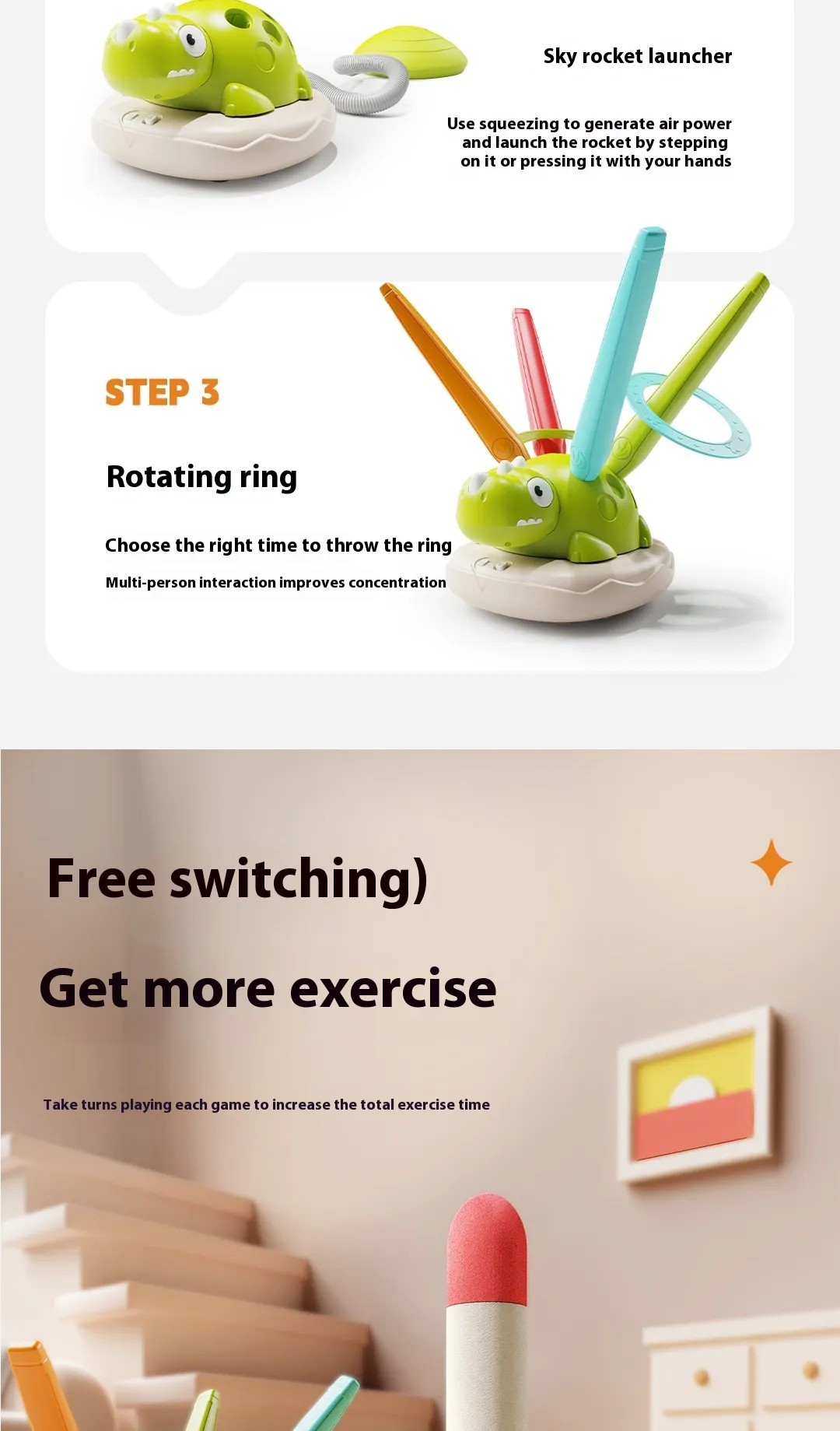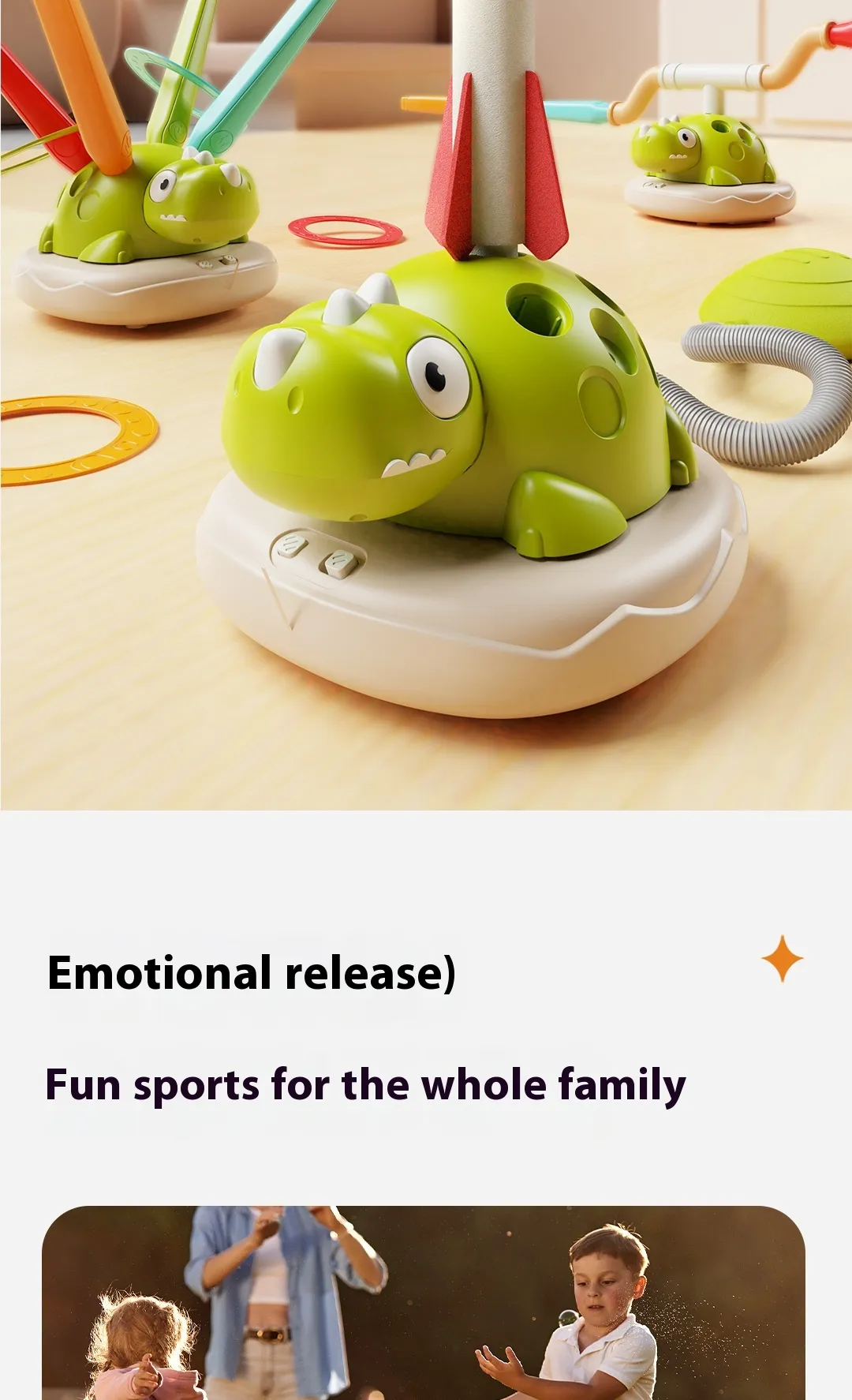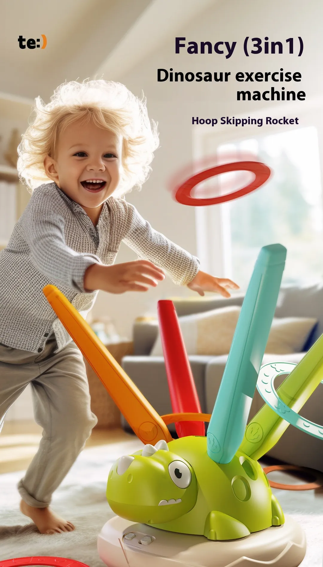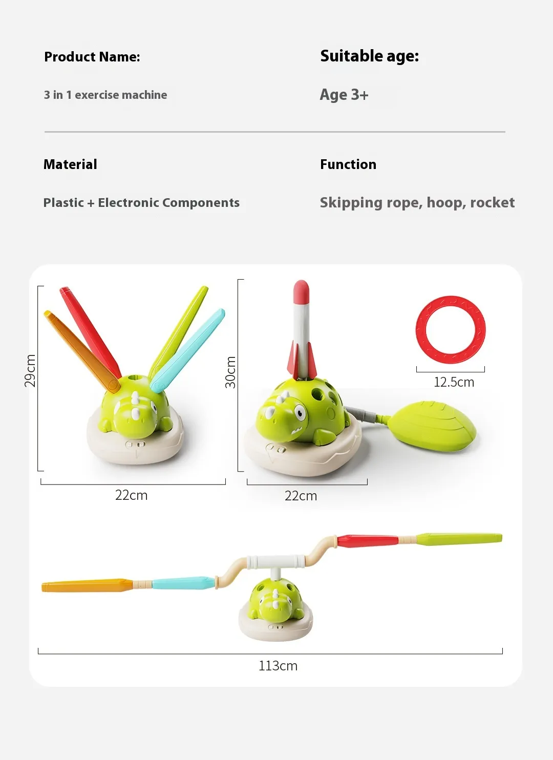The Multifunctional Three-in-one Dinosaur Exercise Machine is a versatile and engaging sports toy designed for children who love to stay active and enjoy fun physical challenges. This exciting, multi-functional toy combines ring throwing, skipping rope, and a skyrocket feature in one compact, easy-to-use machine. Whether it’s for indoor or outdoor play, this toy is perfect for keeping kids engaged while promoting physical health, coordination, and active play. Designed with a vibrant dinosaur theme, it captures children's attention and encourages them to enjoy exercising through play.