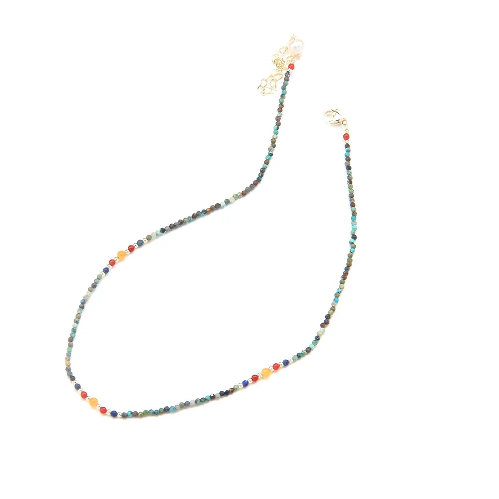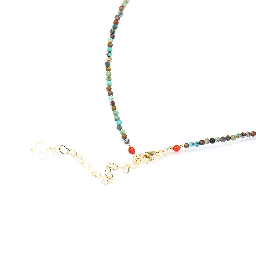 The colourful beads surrounding the pearl pendant add a playful and vibrant pop of color to the design. Their eclectic mix of hues creates an eye-catching contrast against the pearl, giving the necklace a youthful and fun, bohemian-inspired feel.
