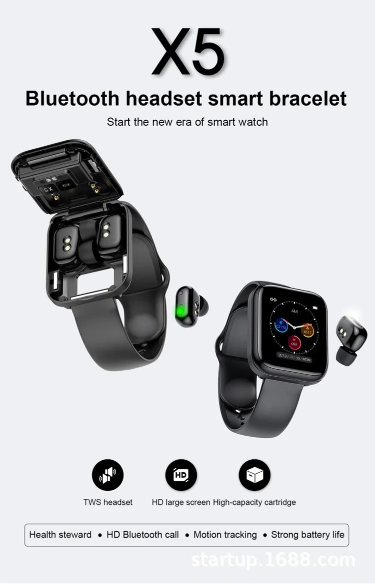 New Product X5 Binaural Smart Bracelet 1.54 Inch Full Screen Bluetooth Headset Combo, Caller Information Call Watch