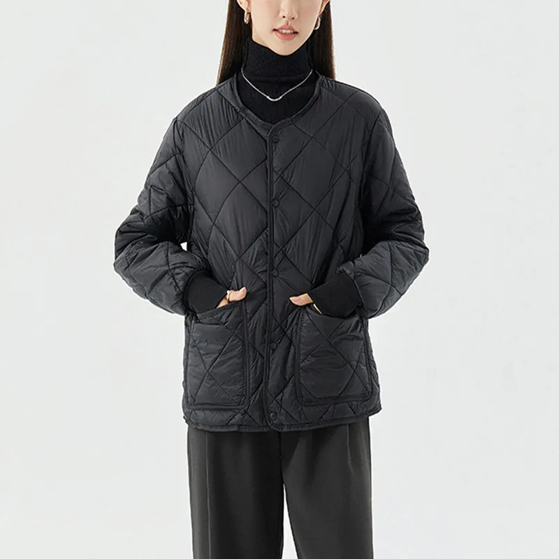 New Rhombus Sewing Cotton Coat Winter Warm Round-neck Jacket With Pockets Lightweight Outerwear For Women's Clothing