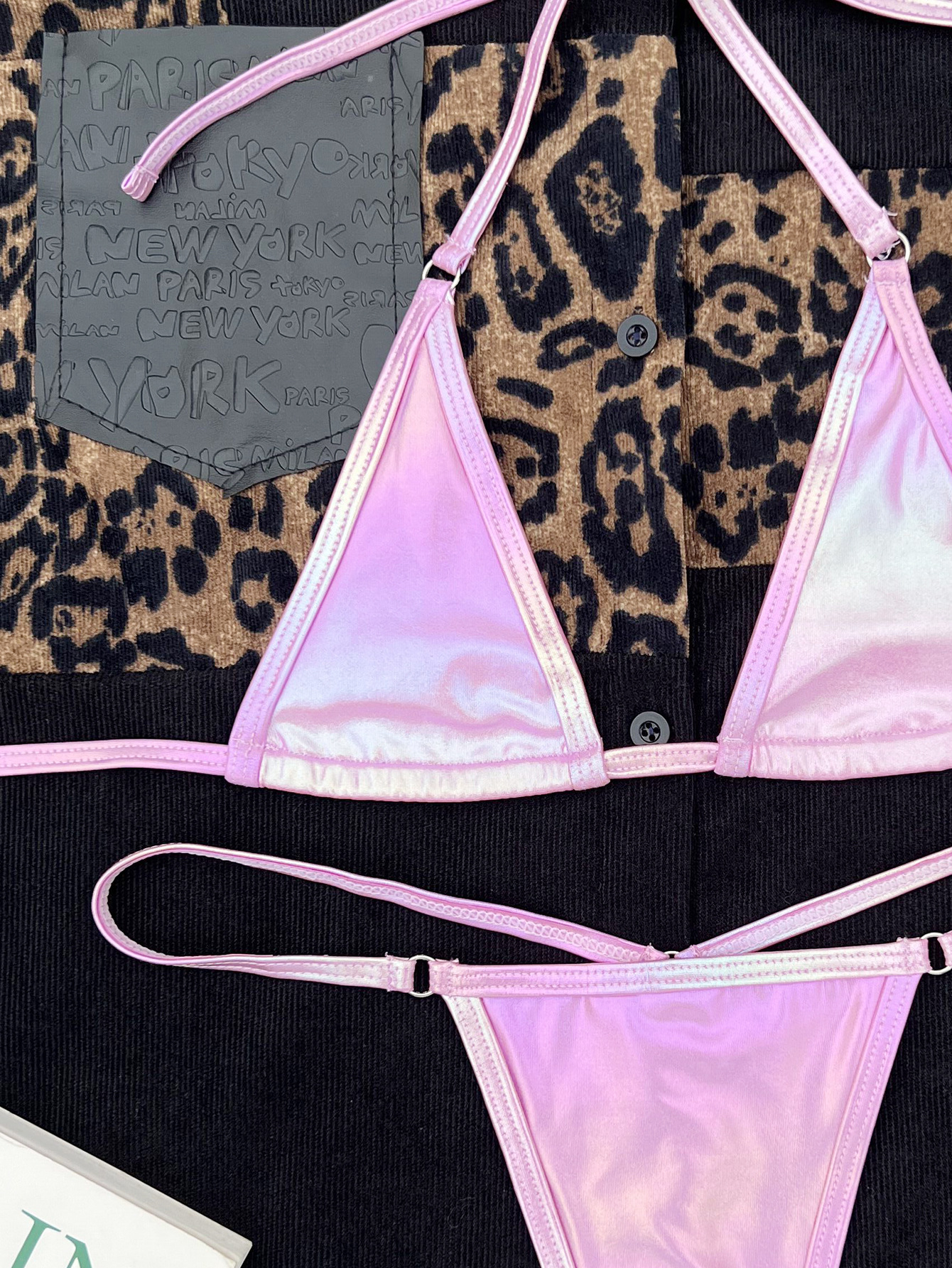 This bikini set is available in a range of stunning gradient colors, allowing you to choose the one that best complements your skin tone and personal style. Whether you prefer a soft pink-to-lilac gradient or a bold metallic sheen, this bikini offers options for every fashion-forward woman. The vibrant, reflective fabric is designed to catch the light, ensuring that you stand out in any setting.