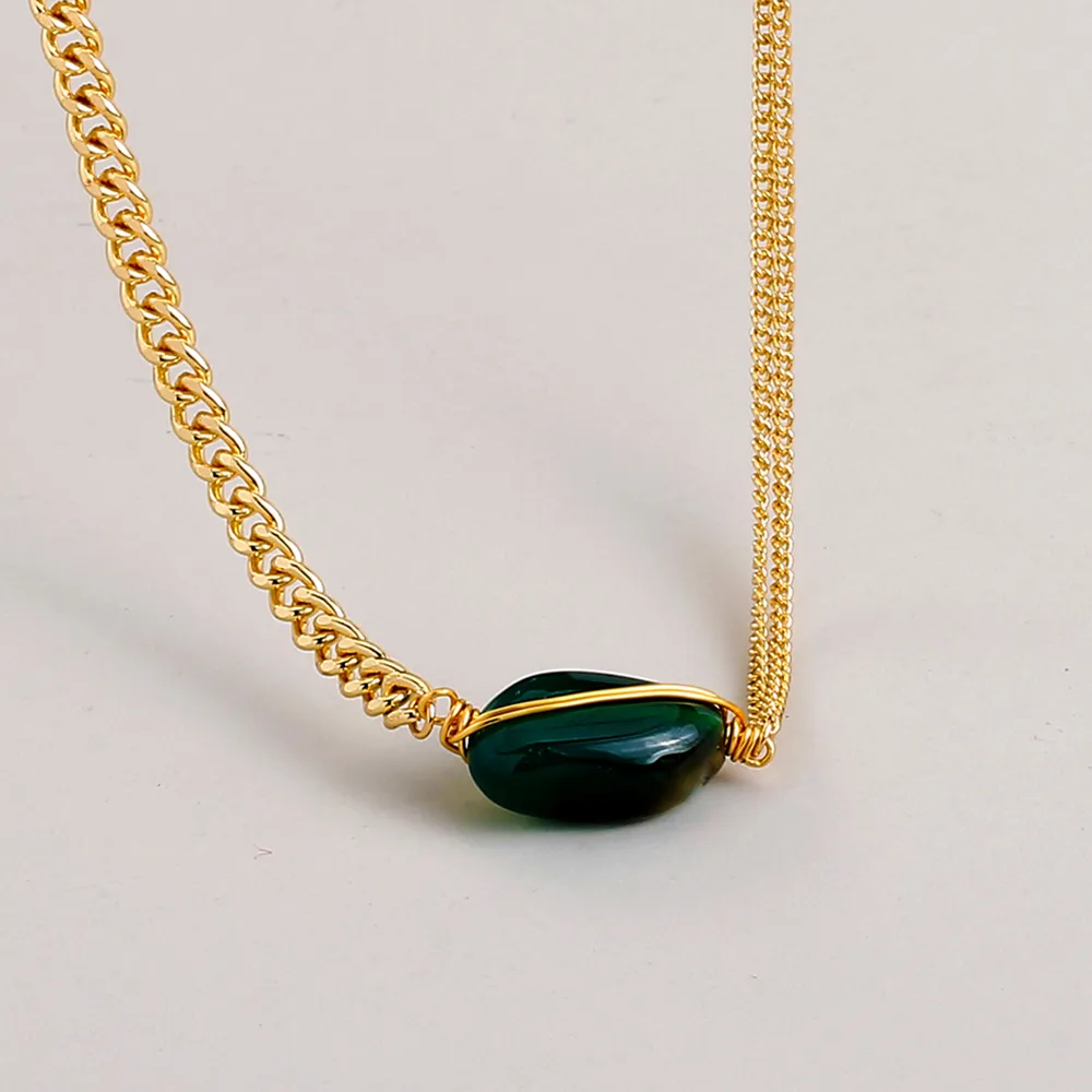 Introducing the Niche Design Double Chain Green Special-shaped Natural Stone Handmade Necklace, a statement piece that blends natural elegance with modern craftsmanship. This necklace features green special-shaped natural stones, artfully arranged on a double chain for a look that is both unique and eye-catching. Handcrafted with care and attention to detail, this necklace brings together the beauty of nature and the artistry of skilled craftsmanship.