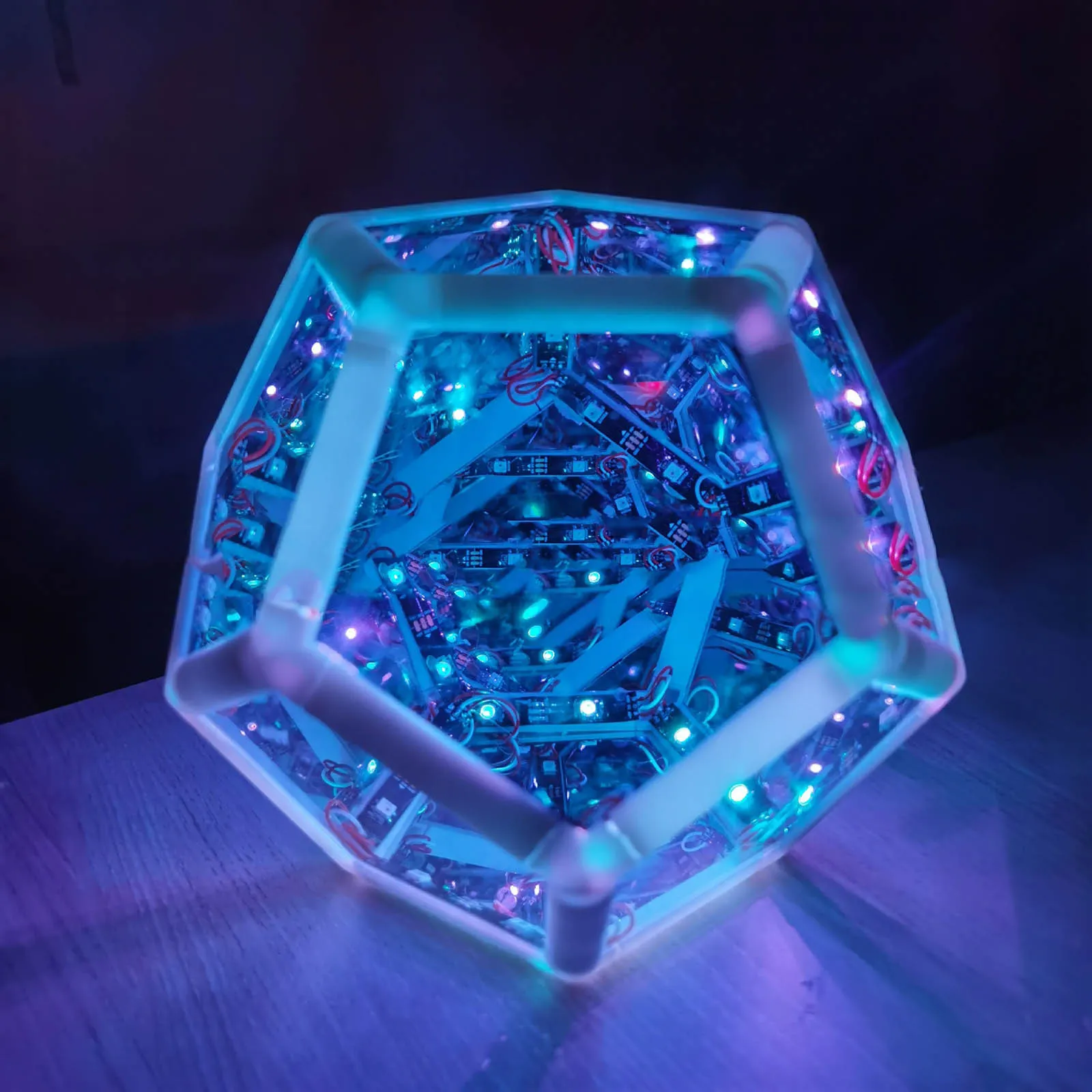 It uses a 12-sided frame, a plastic and acrylic shell, a customized glass mirror and a customized printed circuit board with the highest density. There are nearly a thousand LEDs, which can display colorful shining lighting patterns and animations.