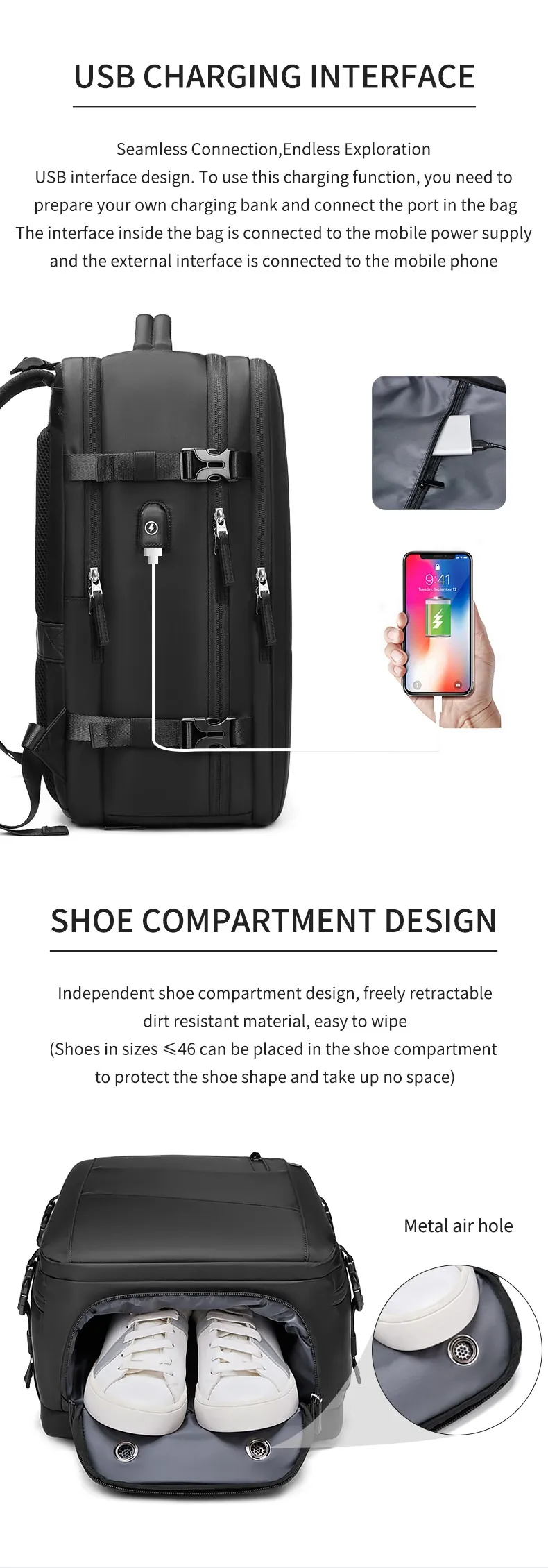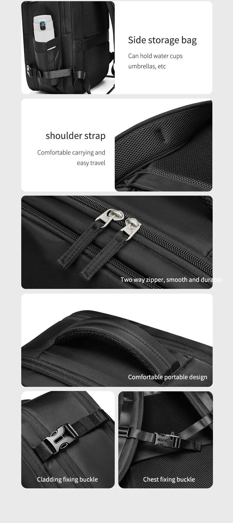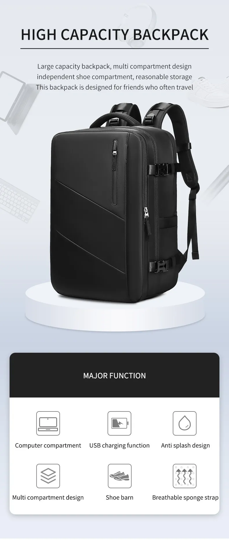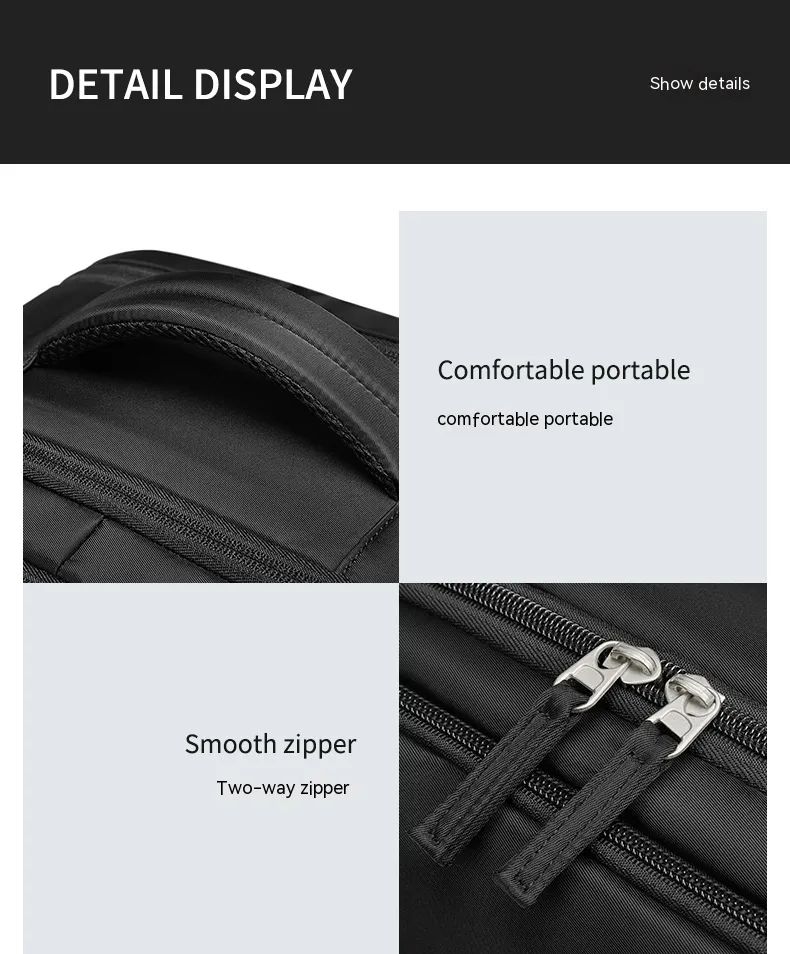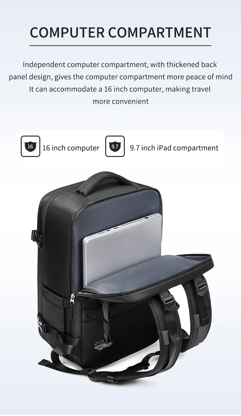 This backpack is equipped with a large main compartment that can easily store clothes, notebooks, tech gear, and other travel essentials. It’s the perfect choice for both short trips and daily use.
