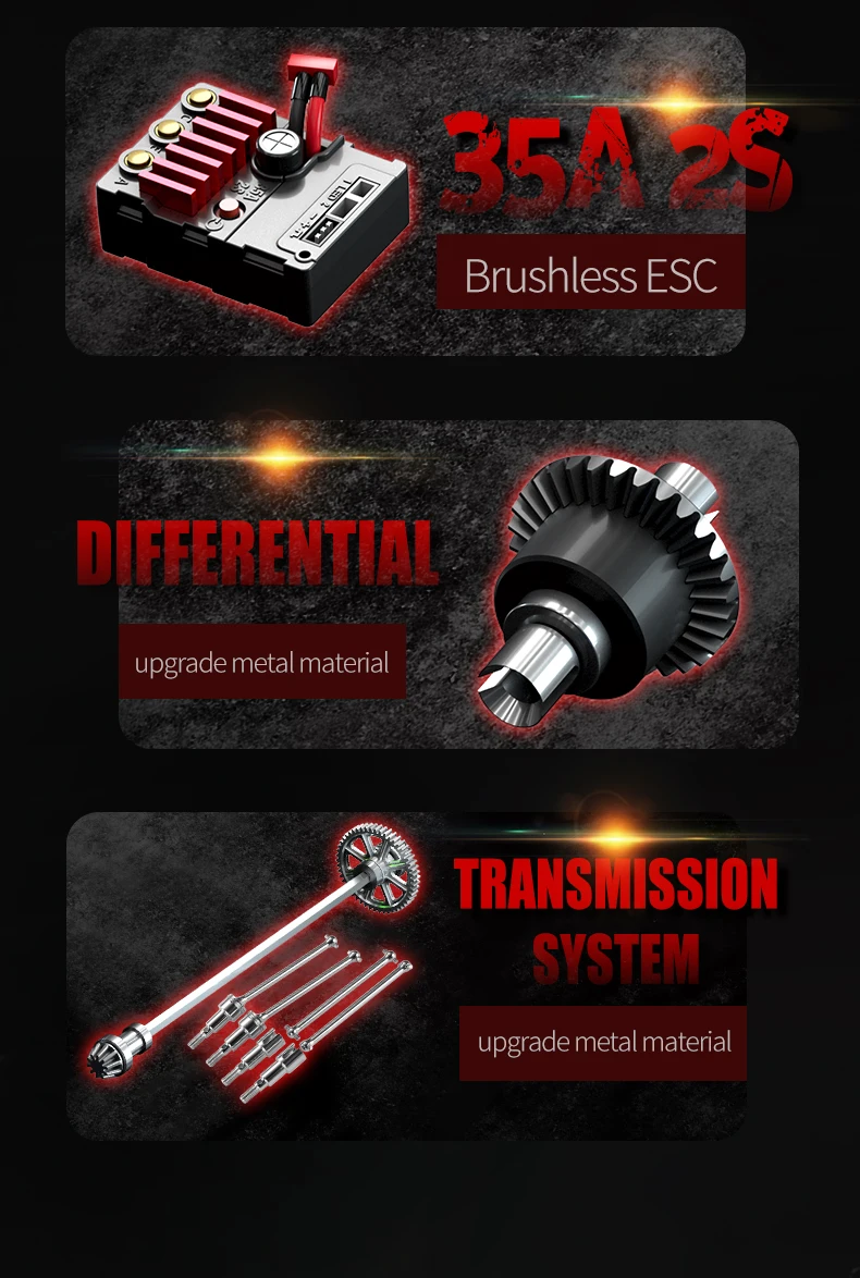 4, 2.4G full proportional synchronous remote control system. Full throttle/steering;