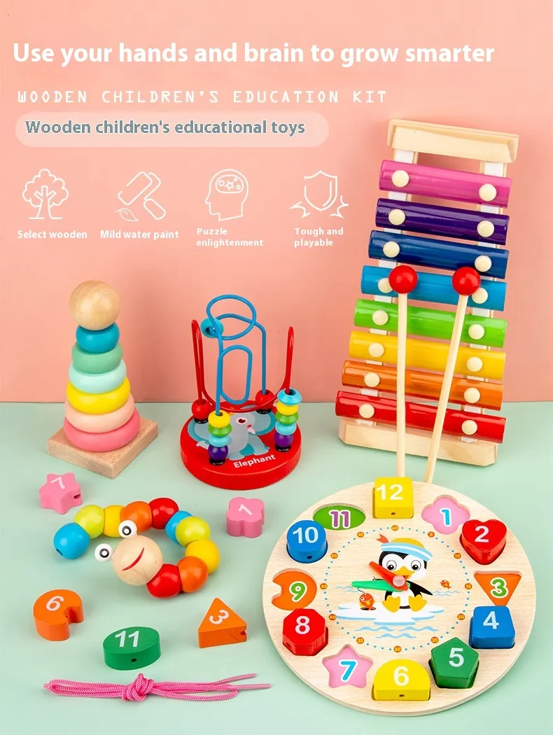 9-piece set: (sand board+sand hammer+four sets ofcolumns+caterpillar+rainbow tower set+hand chime+penguin clock+percussion+small beads+) 1kg