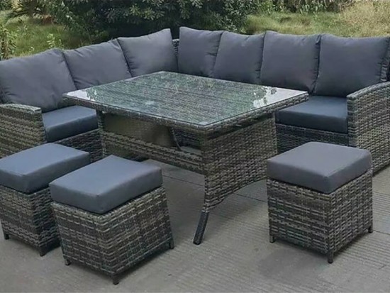 The modular design of the Outdoor Rattan Corner Dining Set allows for flexible arrangement to suit your space and needs. The corner sofa can be configured to fit your patio, balcony, or garden layout, while the stools can be used as additional seating or footrests. This versatility makes the set a great choice for small and large outdoor areas alike, ensuring that you can create the perfect seating arrangement for any occasion.