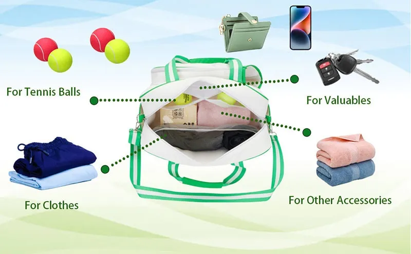 - Spacious Compartments: Room for your tennis racket, balls, and accessories like a water bottle or towel.