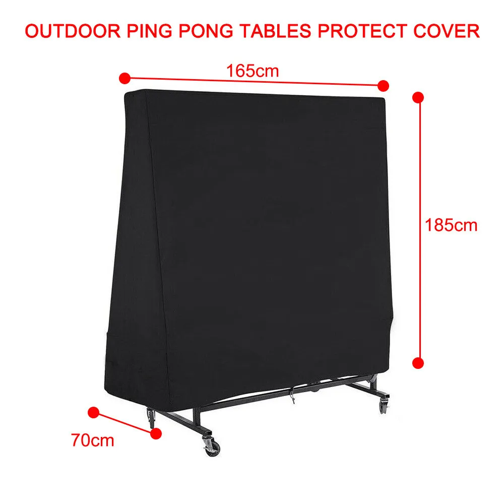 The cover is designed to fit most standard-sized outdoor table tennis tables, whether folded upright or fully extended, offering versatile protection.