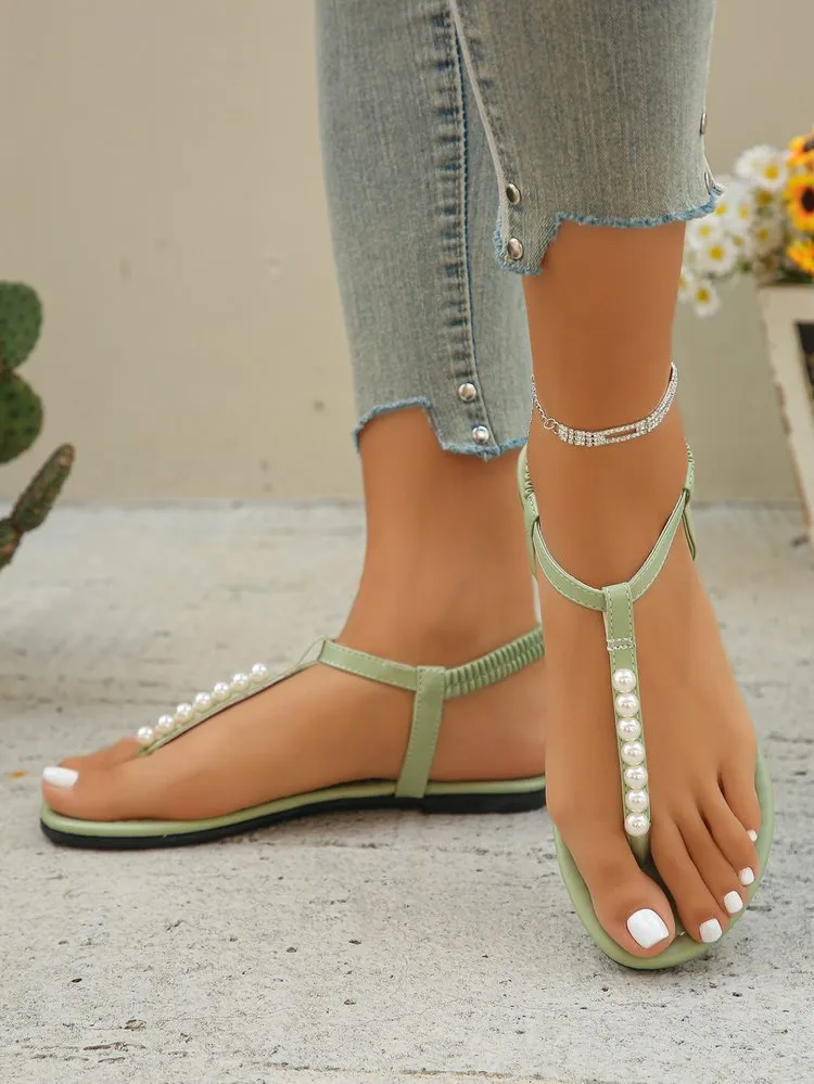 Pearl Thong Sandals – Elegant T-Strap Flat Sandals for Summer Beach Fashion