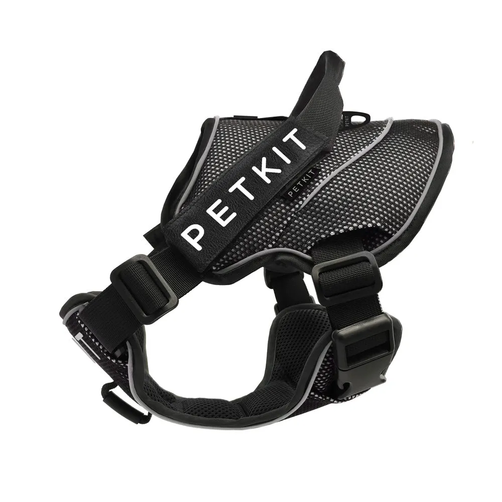 The harness is equipped with reflective stitching or strips, enhancing visibility during nighttime or low-light walks.