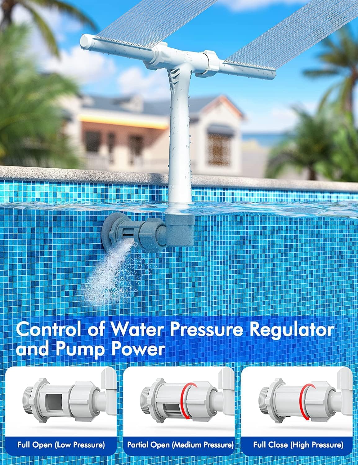 Adjust water pressure, and height with the side valve on the bottom, and ensure optimal performance by facing the nozzles towards the pool when changing direction.