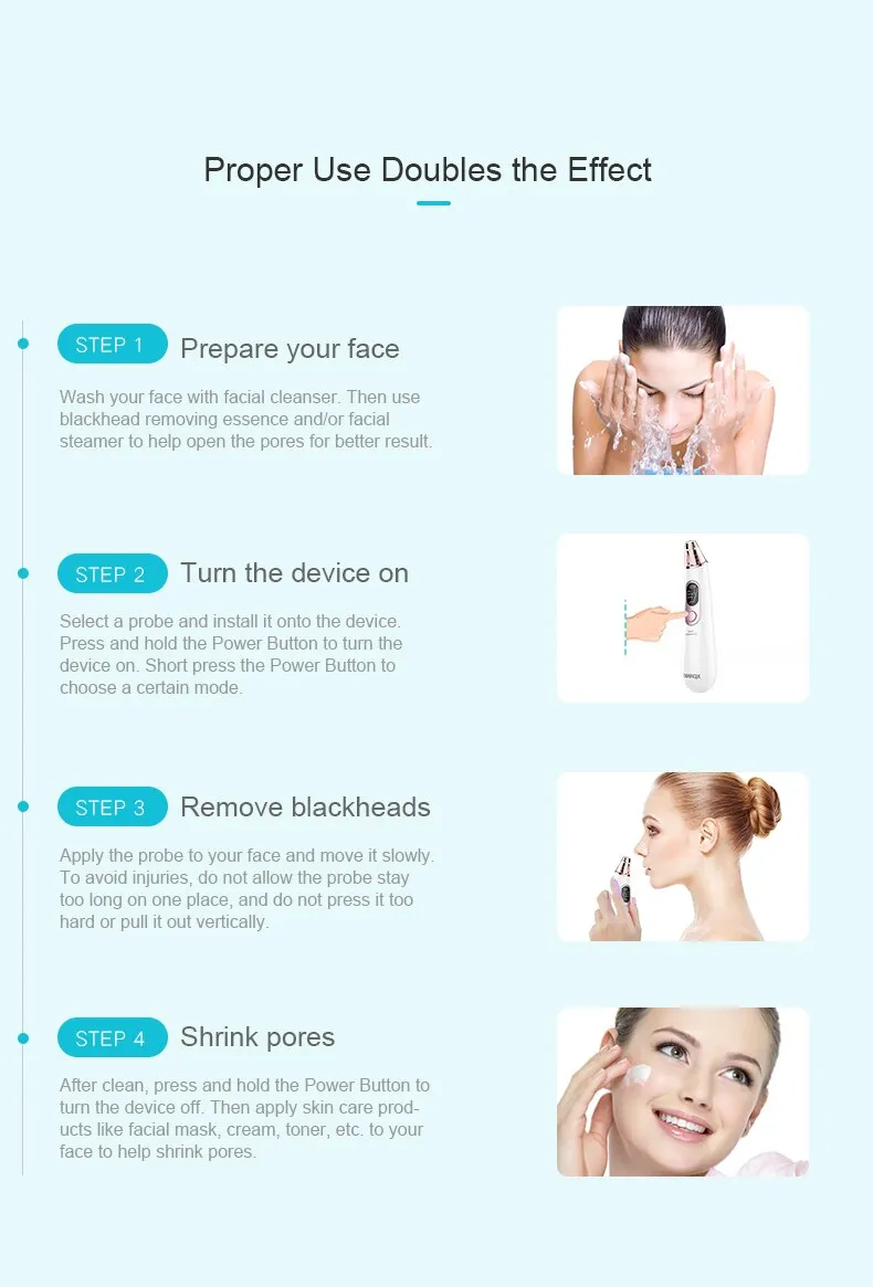 After cleaning, press and hold the key to turn off the power, then use the facial care product mask, cream, etc. to shrink the pores.