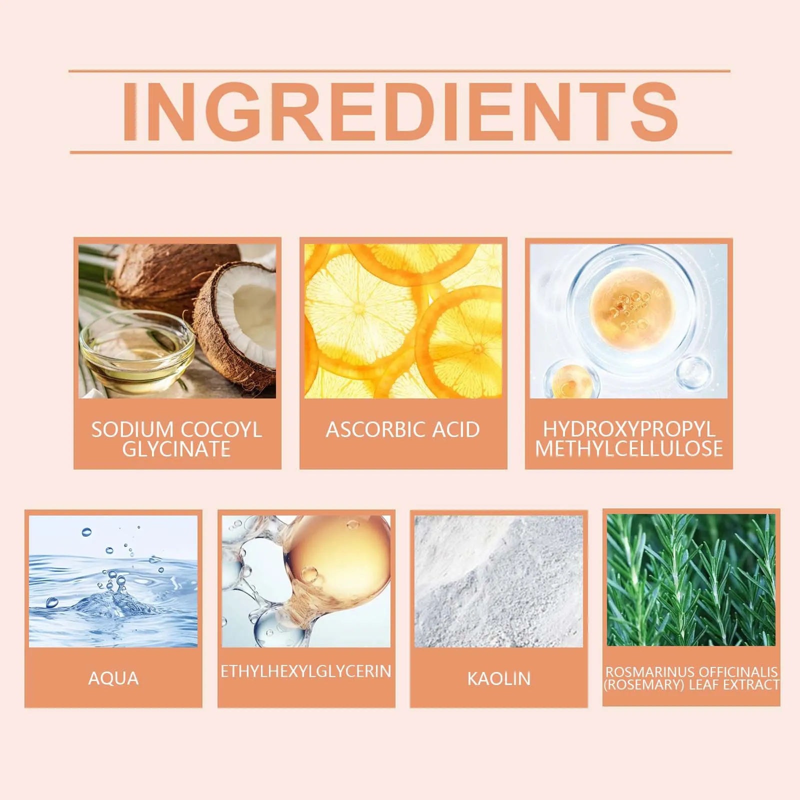 Ingredients: Water, Sodium Cocoyl glycinate, hydroxypropyl methyl cellulose, ethyl hexyl glycerol, vitamin C (ascorbic acid), kaolin,