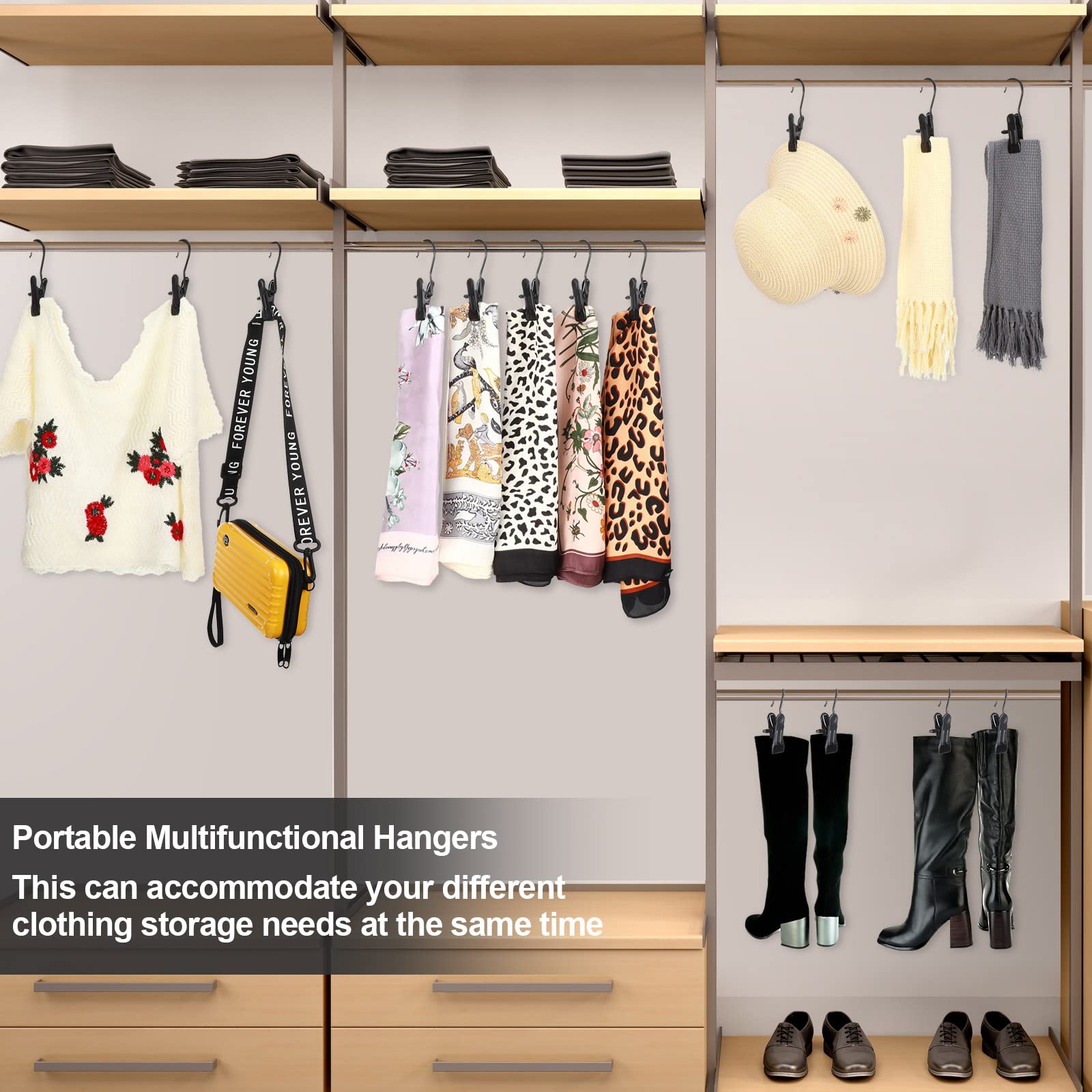 - MAGIC HANGERS WITH CLIPS: Our clip hangers are designed to hold a wide variety of stuffs in your daily life, such as clothes, pants, boots, hats, towels, socks, handbags, pillows, belts, snack bags, etc. The metal clips can rotate 360°. You can use it as both clips and hook. This clothing hanger can help you organize your room and life well. More convenient than standard clothes hangers.