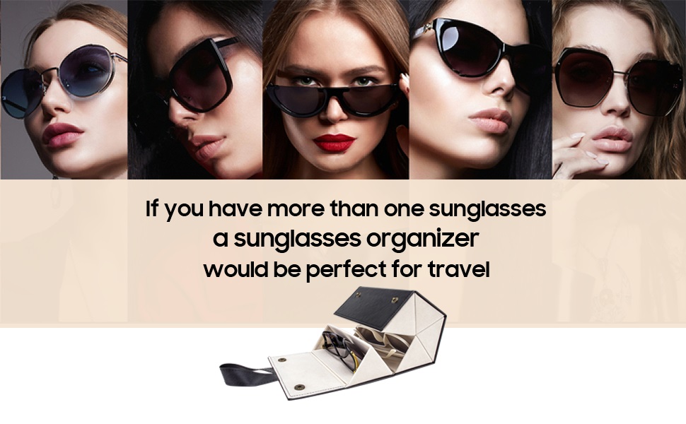 - Travel sunglasses organizer is made of PU leather, sturdy enough, never scratch your lens. Whether it's hanging in the wardrobe at home or folding up on the vanity table, it always meet your collection needs in an perfectly organized style.