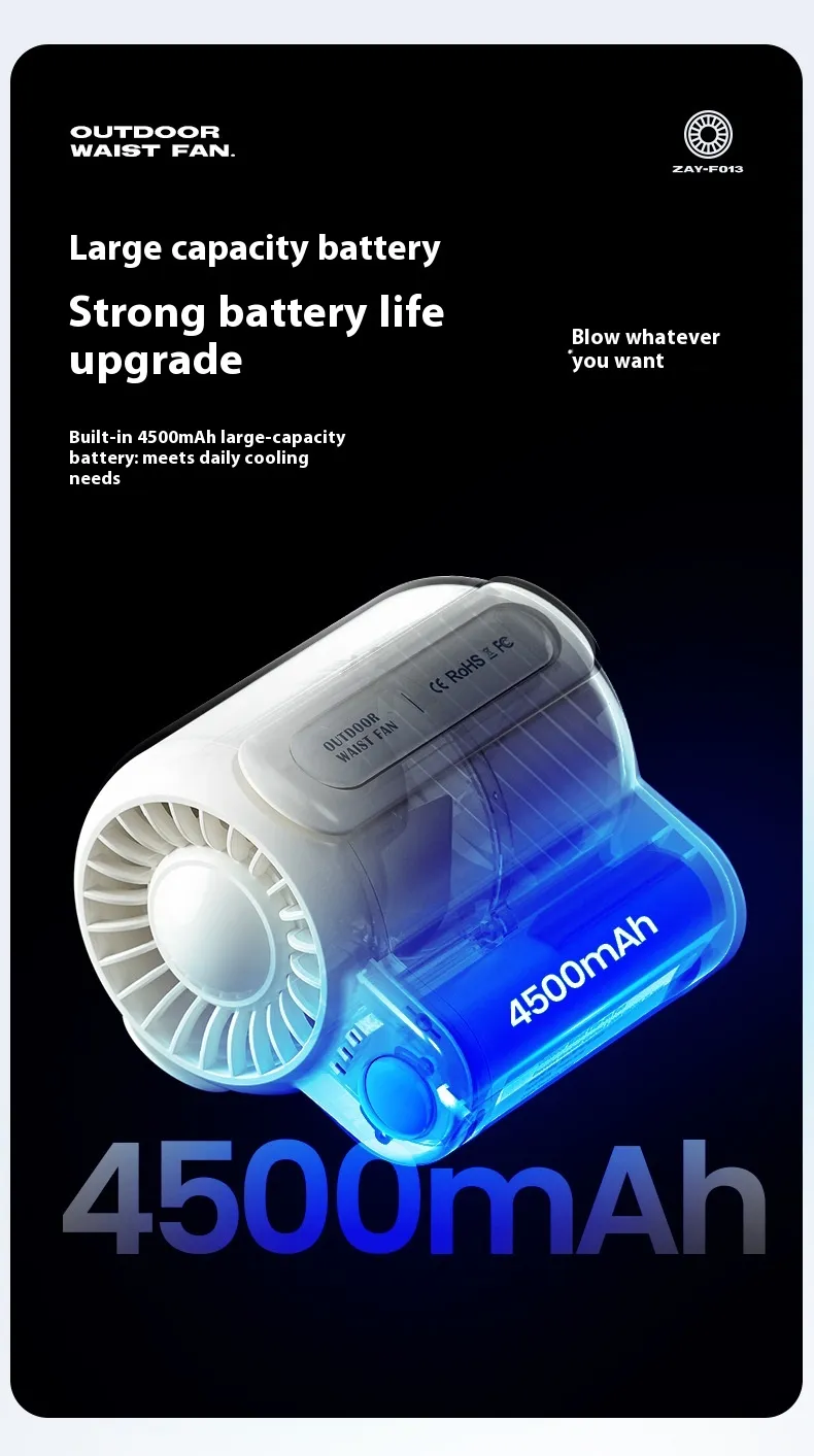 3. Reliable Material: Equipped with a robust 4500mAh battery, our waist fan provides enduring relief, even in extreme conditions, thanks to its high-quality build.