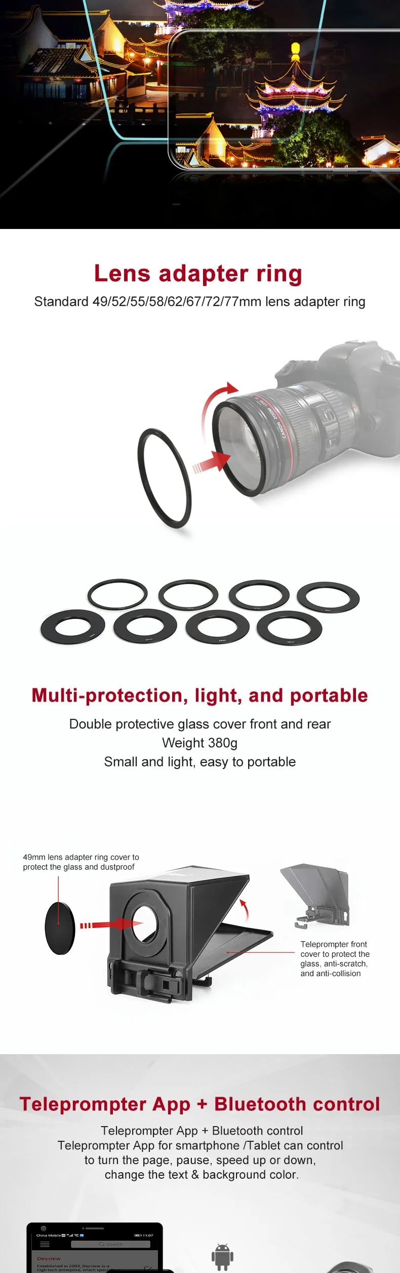 Packing list: teleprompter, mobile phone holder, mobile phone/tablet holder, adapter ring, remote control, hexagon wrench + screws, foam