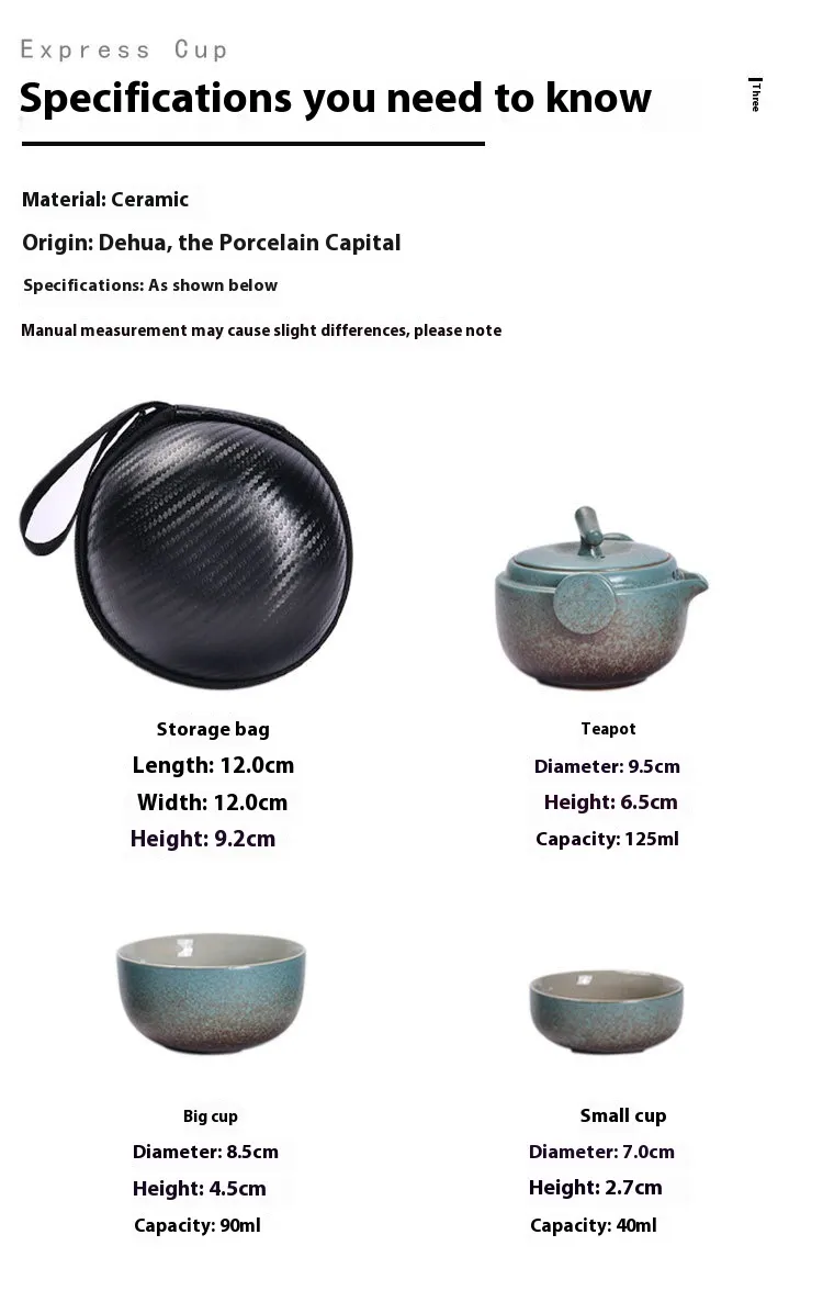 Teapot * 1 large cup * 1 small cup * 1 storage bag * 1