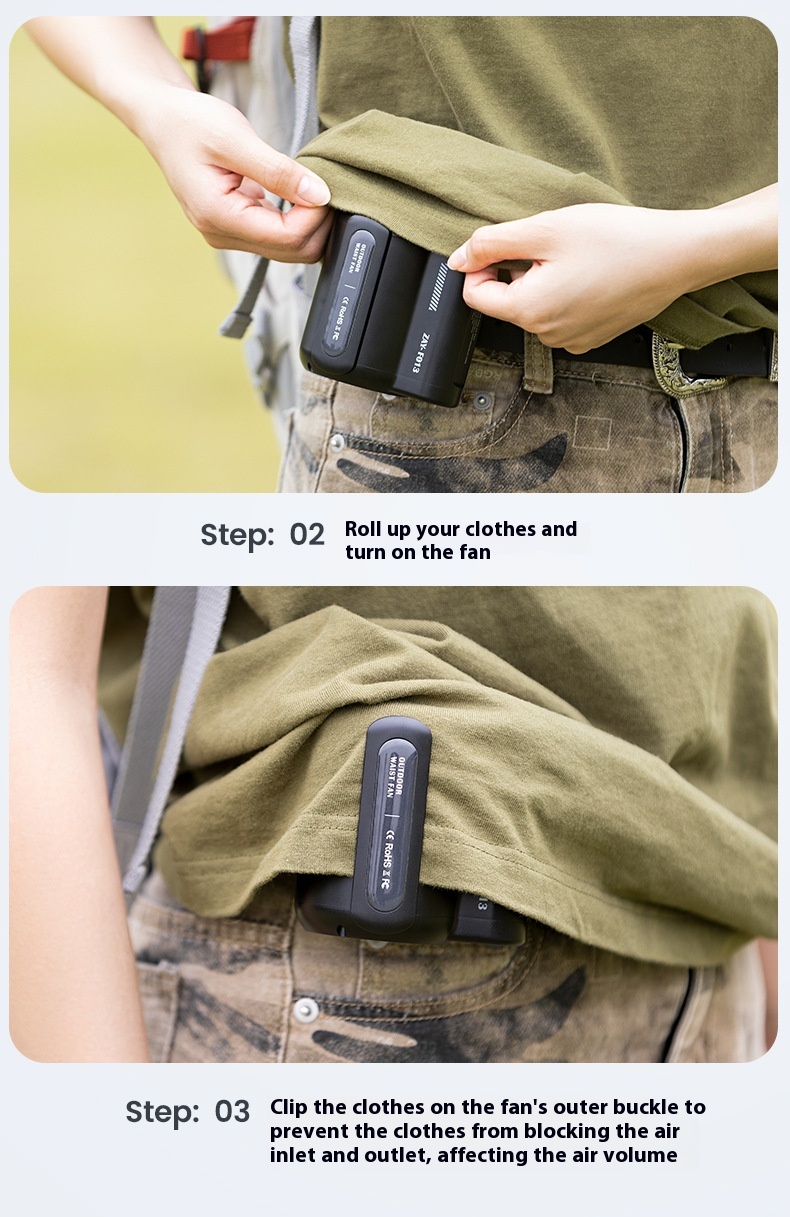 2. Adjustable Airflow: With three adjustable speeds, the waist fan lets you personalize your air flow and stay hands-free for unrestricted movement during outdoor activities.