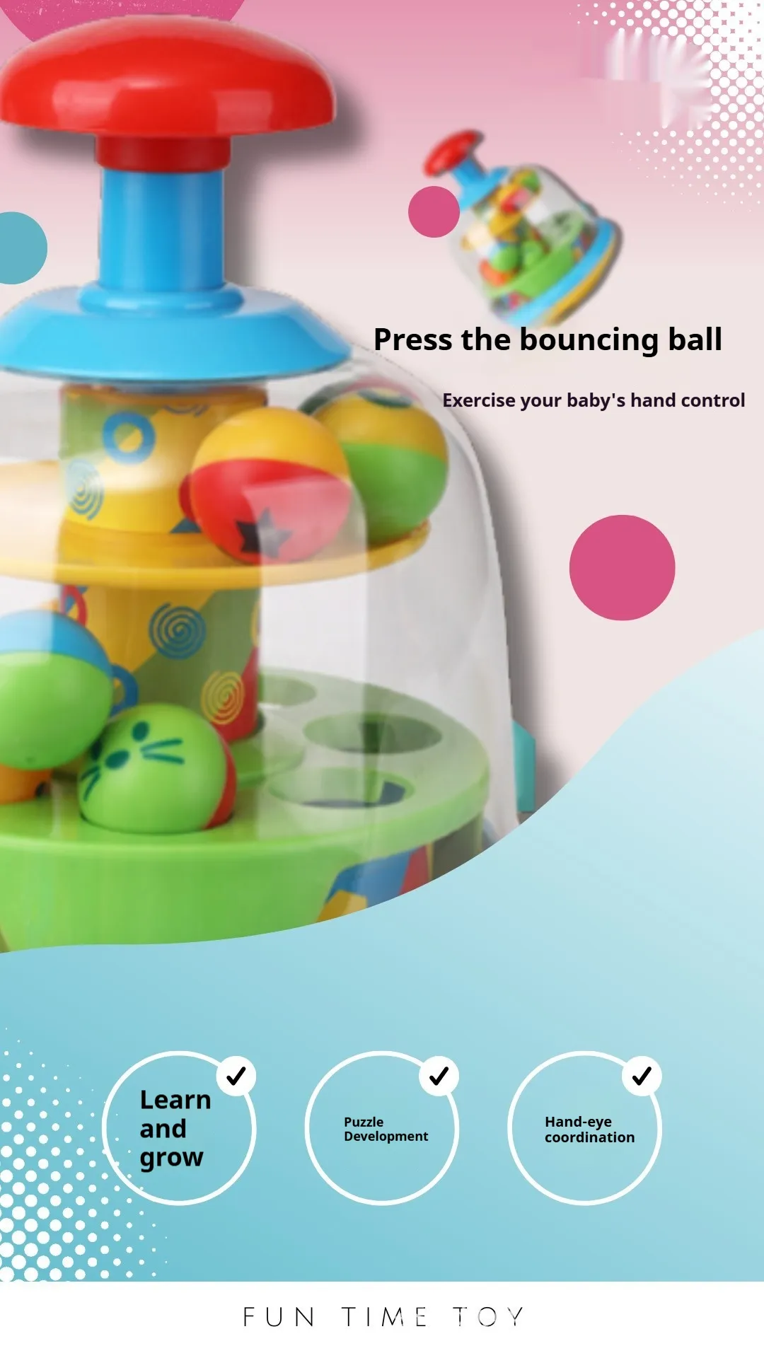The Press Rotating Jumping Ball Enlightening Early Education Toy is a wonderful tool for helping your infant