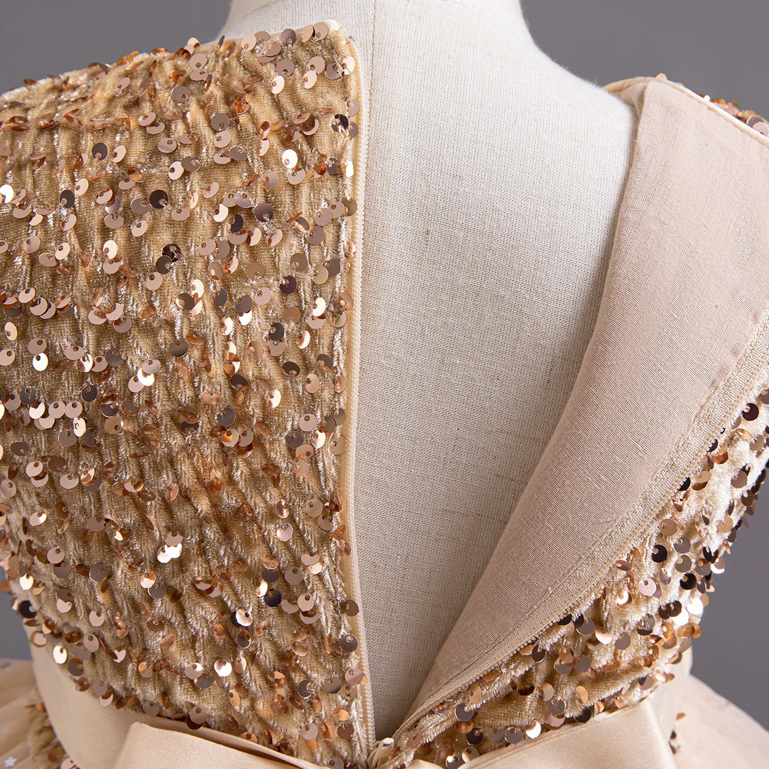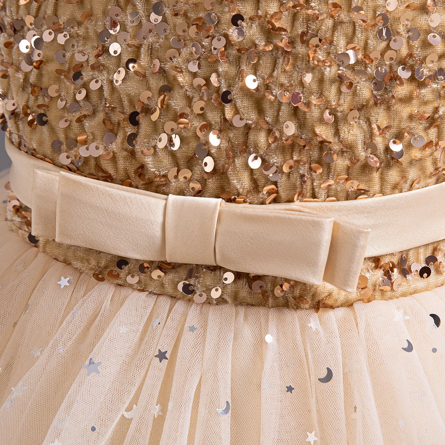 Glittering sequins on the bodice create a stunning and eye-catching look, ideal for photos and celebrations.