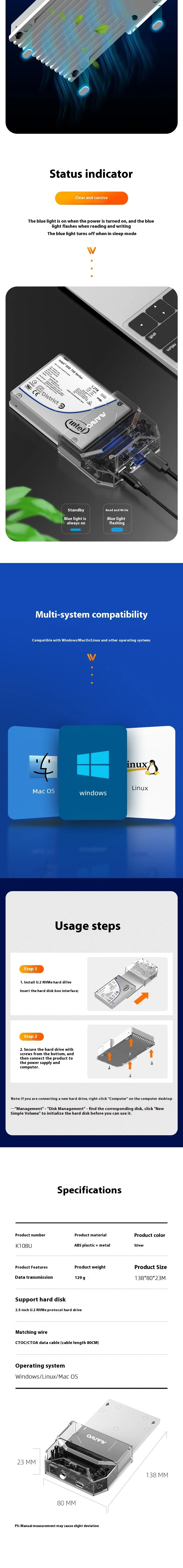 Made from high-quality materials, the hard disk reader is built to withstand daily use, ensuring that it can handle all your data management tasks without wearing down. Its durable exterior offers protection against bumps and scratches, making it the ideal tool for users who need to access their data on the go while ensuring that their equipment stays safe.