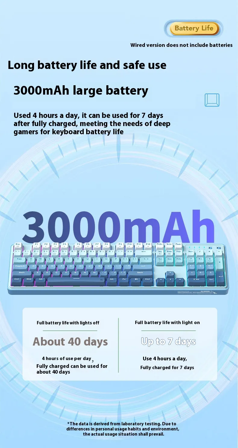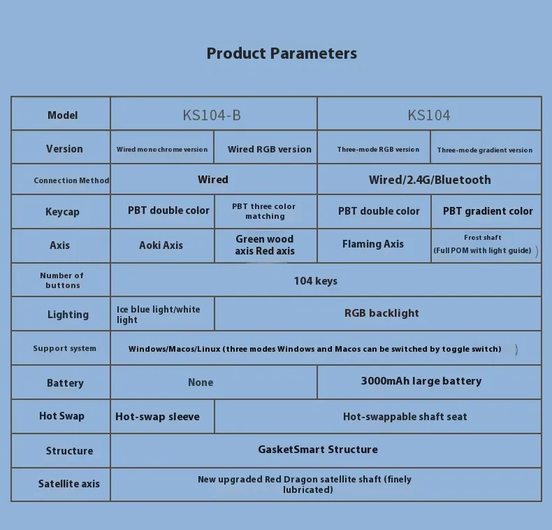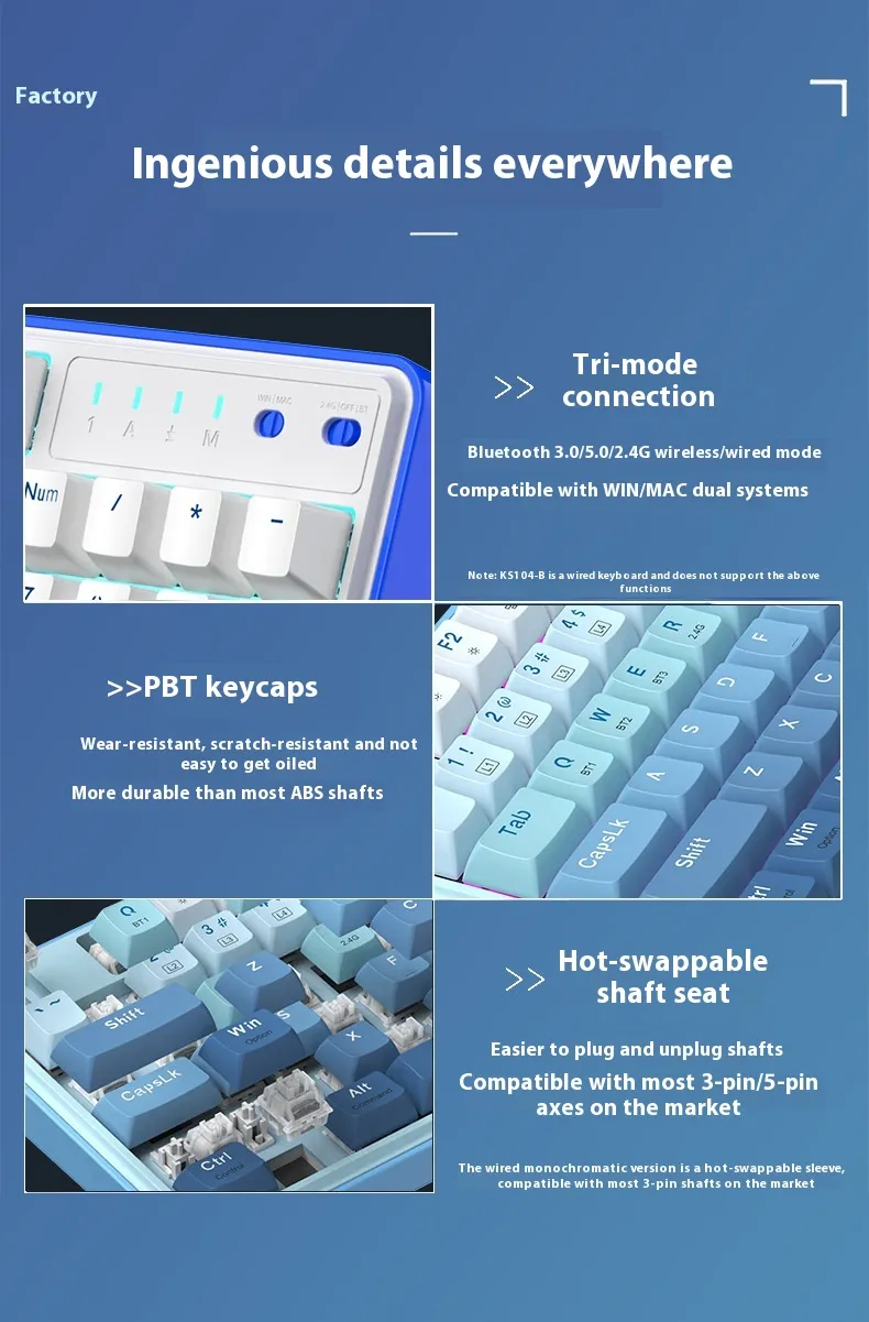 blue wired RGB green wood shaft, 104 keys Purple Yellow Blue wired RGB fire red shaft, 104 key black white Three mode RGB fire red axis, 104
