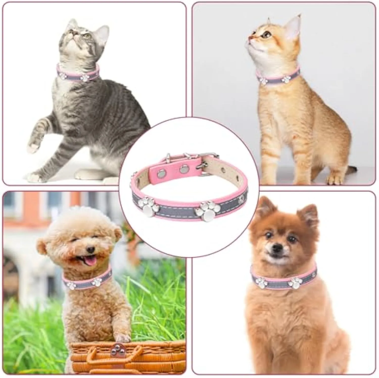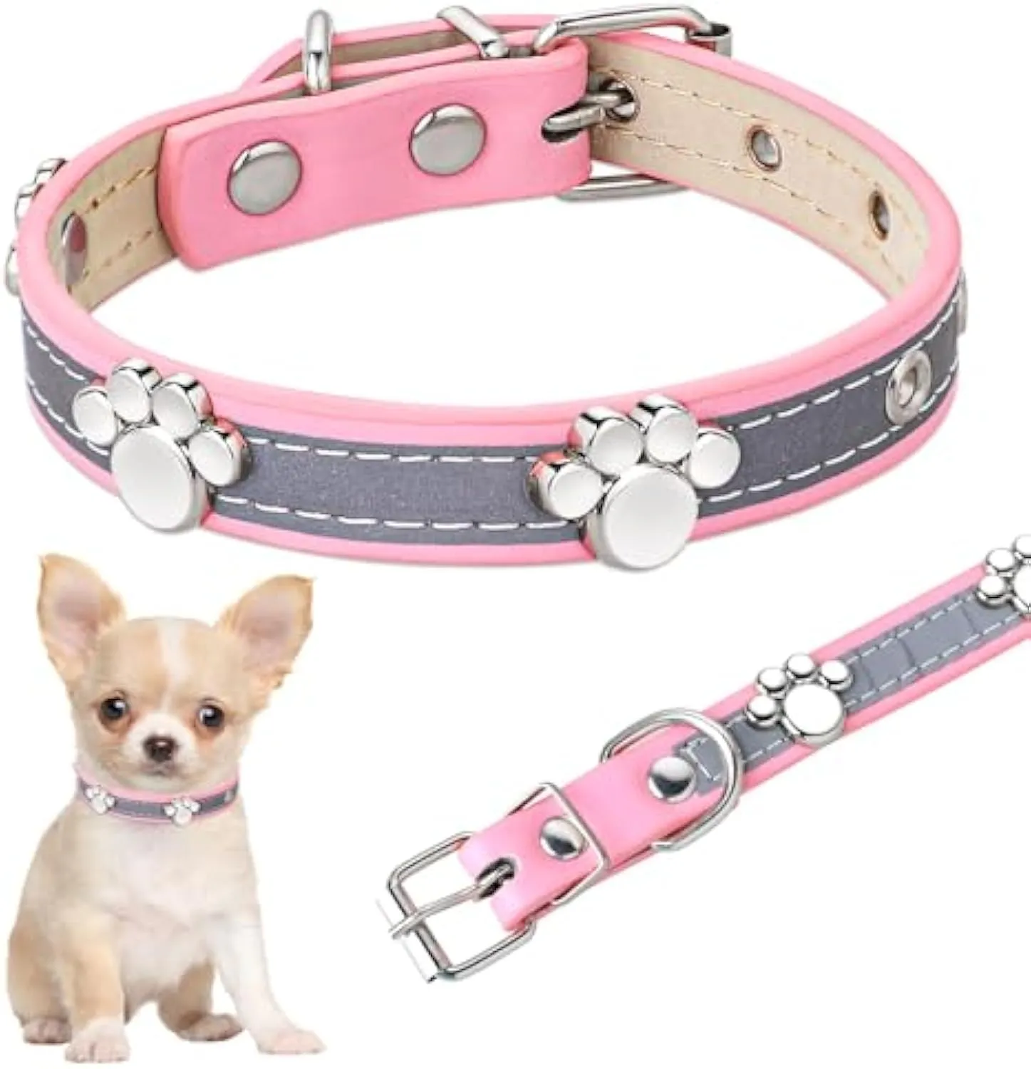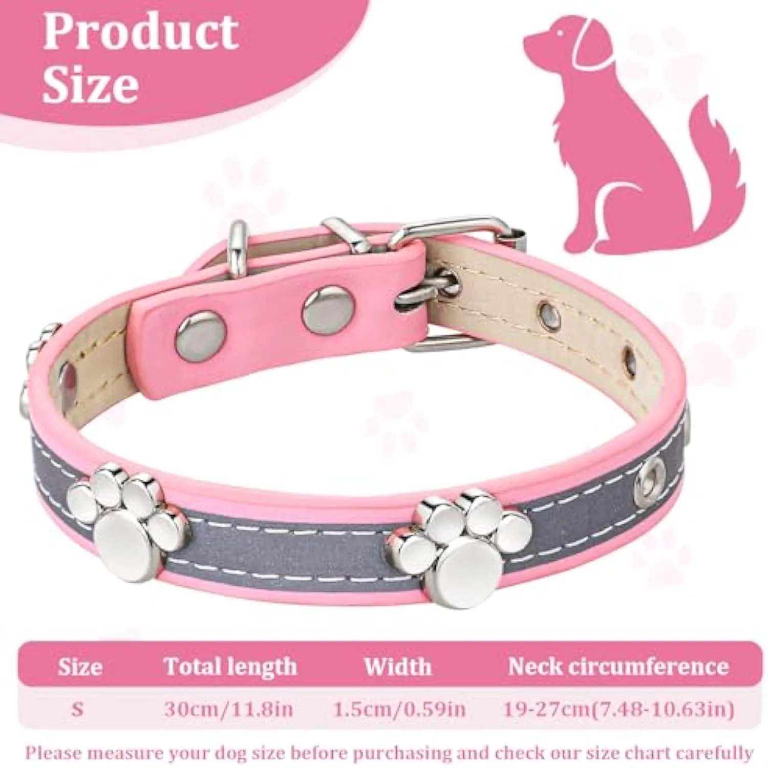 Reflective Dog Collar Leather Dog Collar For Small Medium Large Dogs Cats Adjustable Girl Puppy Dog Collars With Cute Paw Rivet