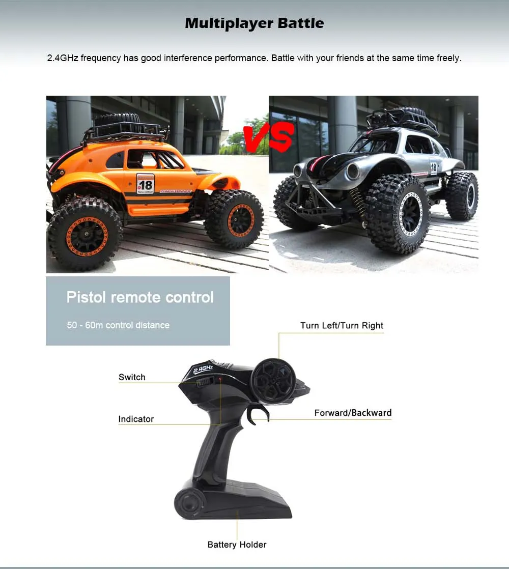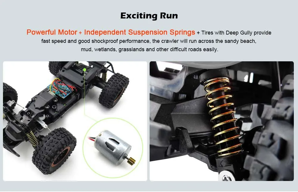 Strong power engine provides high torque to ensure that the car completes difficult movements. No matter the land, sandy beach, mud,