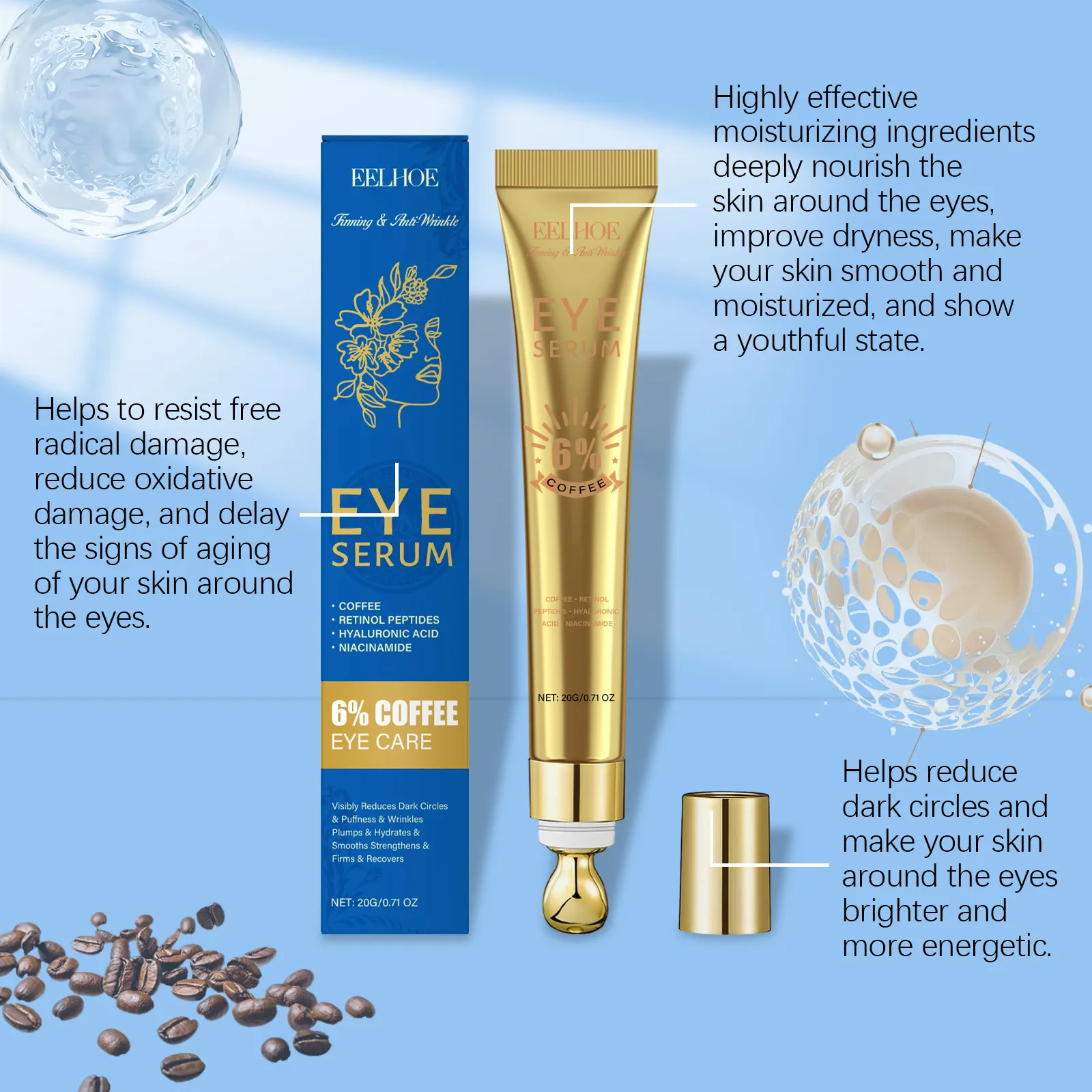 Ingredients: Water, glycerin, coffee extract, Hydroxyethyl Cellulose, retinol, hyaluronic acid, Oligopeptide-1, nicotinamide