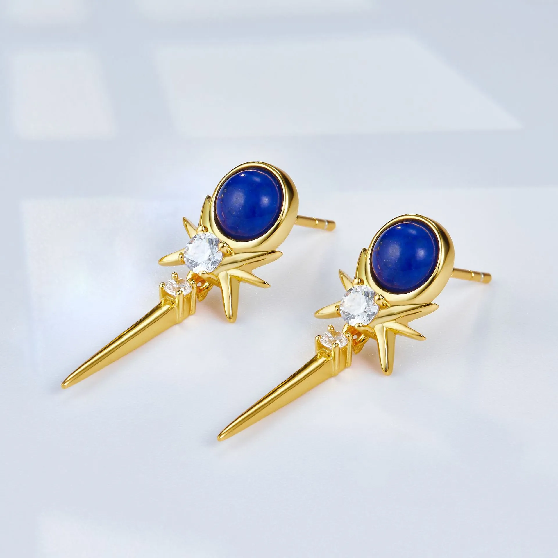 At the heart of these earrings lies the lapis lazuli gemstone, a striking blue stone prized for its deep, vivid color. Known as the "Stone of Wisdom," lapis lazuli has been revered for its beauty and metaphysical properties. The stone is said to enhance mental clarity and spiritual awareness, making these earrings not just a stunning accessory but also a symbol of personal growth.